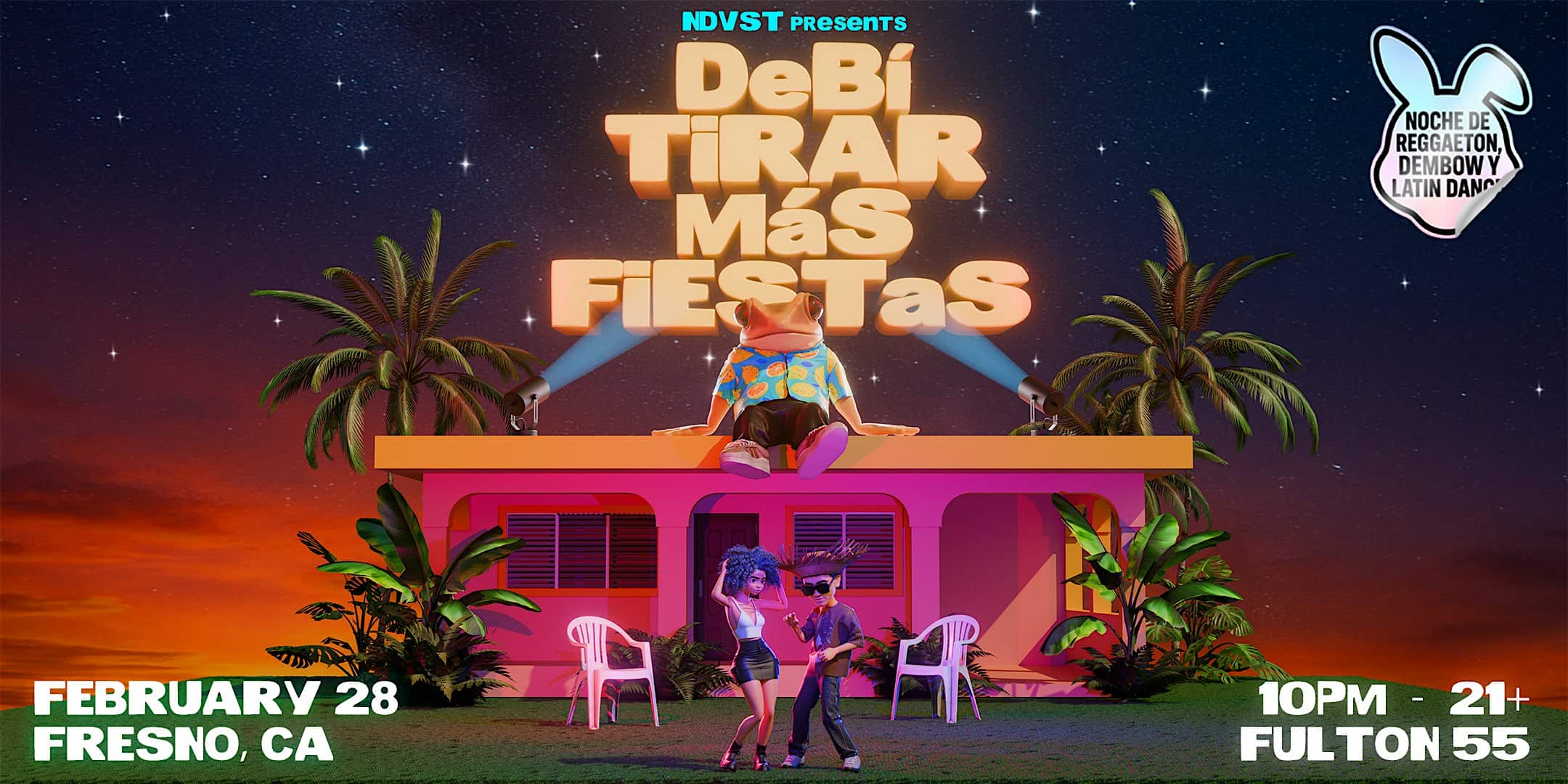 by admin14Feb DEBÍ TIRAR MÁS FIESTAS | REGGAETON, DEMBOW, MERENGUE, Y LATIN DANCE BANGERS at Fulton 55 – Fresno, CA DEBÍ TIRAR MÁS FIESTAS | REGGAETON, DEMBOW, MERENGUE, Y LATIN DANCE BANGERS at Fulton 55 – Fresno, CA 2 2 people viewed this event. FRESNO! Party with us as we celebrate reggaeton, dembow, merengue, & latin dance hits! Tickets-RSVP Link Date And Time Sunday, March 1st, 2026 06:00 AM (PST) Venue Fulton 55 Location 875 Divisadero Street, Fresno, CA 93721 Event Types MusicParty or Social Gathering Event Category California Share With Friends Facebook Twitter Linkedin Xing Pinterest Share This Post: