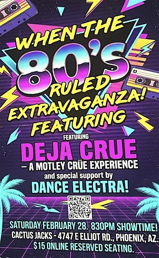 by admin13Feb DEJA CRUE w/ Dance Electra @ Cactus Jacks Sat Feb 28th at Cactus Jack’s Bar & Grill – Phoenix, AZ DEJA CRUE w/ Dance Electra @ Cactus Jacks Sat Feb 28th at Cactus Jack’s Bar & Grill – Phoenix, AZ 2 2 people viewed this event. Arizona! DEJA CRUE w/ Dance Electra @ Cactus Jacks Sat Feb 28th. Doors open at 8:30p! $15 RSVP seating for info text 602-559-8393 Tickets-RSVP Link Date And Time Sunday, March 1st, 2026 03:00 AM (PST) Venue Cactus Jack's Bar & Grill Location 4747 East Elliot Road, Phoenix, AZ 85044 Event Types Concert or PerformanceMusic Event Category ArizonaPhoenix Share With Friends Facebook Twitter Linkedin Xing Pinterest Share This Post: