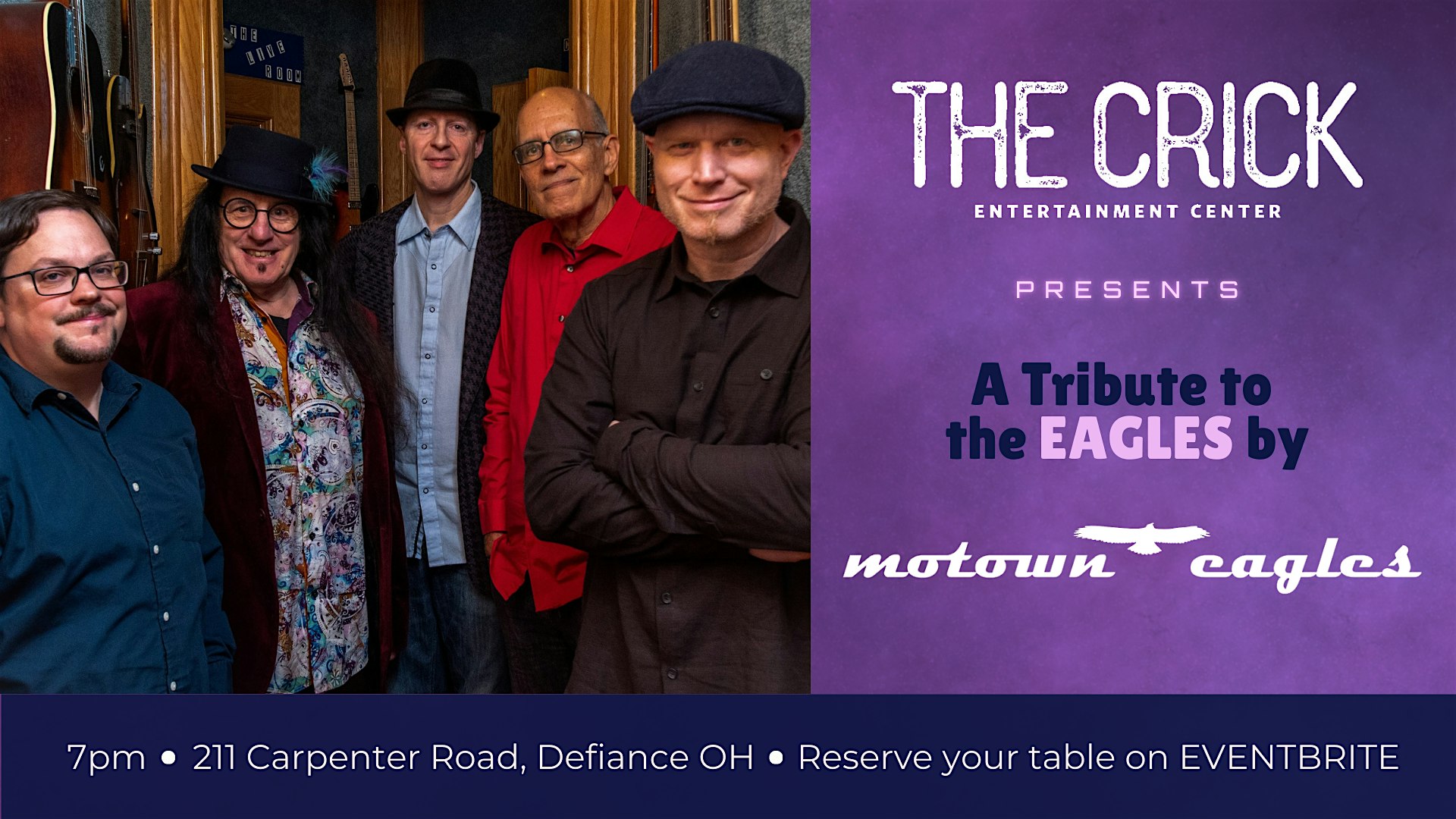 by admin13Feb Eagles Tribute by the Motown Eagles at The Crick Entertainment Center – Defiance, OH Eagles Tribute by the Motown Eagles at The Crick Entertainment Center – Defiance, OH 3 3 people viewed this event. Motown Eagles, Detroit’s Eagles tribute band with such attention to detail you’ll swear you’re listening to the real thing. Tickets-RSVP Link Date And Time Sunday, March 1st, 2026 12:00 AM (PST) Venue The Crick Entertainment Center Location 211 Carpenter Road, Defiance, OH 43512 Event Types Concert or PerformanceMusic Event Category Ohio Share With Friends Facebook Twitter Linkedin Xing Pinterest Share This Post: