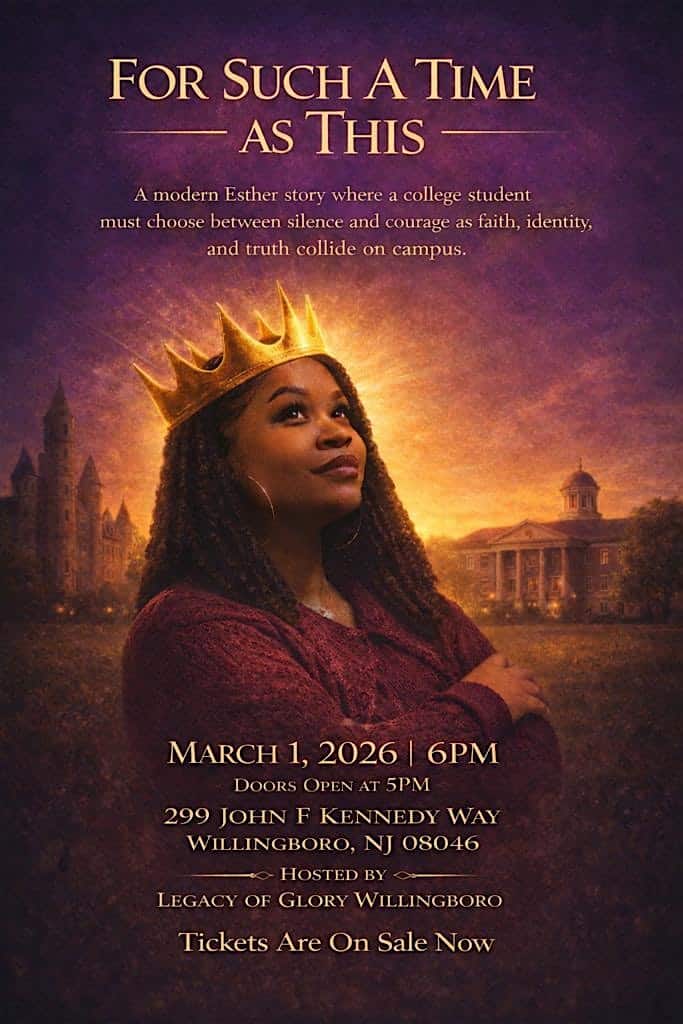 by admin14Feb For Such A Time As This at 299 John F Kennedy Way – Willingboro, NJ For Such A Time As This at 299 John F Kennedy Way – Willingboro, NJ 2 2 people viewed this event. A modern Esther story where a college student must choose between silence and courage as faith, identity, and truth collide on campus. Tickets-RSVP Link Date And Time Sunday, March 1st, 2026 11:00 PM (PST) Venue 299 John F Kennedy Way Location 299 John F Kennedy Way, Willingboro, NJ 8046 Event Types Concert or Performance Event Category New Jersey Share With Friends Facebook Twitter Linkedin Xing Pinterest Share This Post:
