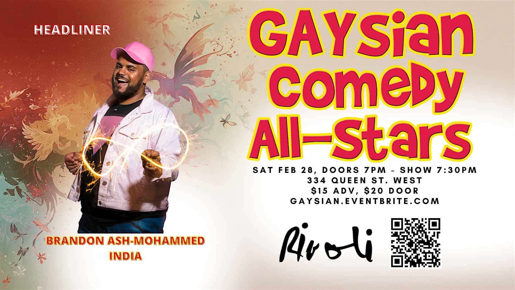 by admin14Feb Gaysian Comedy All-Stars with Brandon Ash-Mohammed! at Rivoli Pool Hall – Toronto, ON Gaysian Comedy All-Stars with Brandon Ash-Mohammed! at Rivoli Pool Hall – Toronto, ON 2 2 people viewed this event. We are the WORLD’s first All-Queer, All-Asian, Comedy Showcase! Tickets-RSVP Link Date And Time Sunday, March 1st, 2026 12:00 AM (PST) Venue Rivoli Pool Hall Location 334 Queen Street West, Toronto, ON M5V 2A2 Event Types Concert or PerformancePerforming & Visual Arts Share With Friends Facebook Twitter Linkedin Xing Pinterest Share This Post: