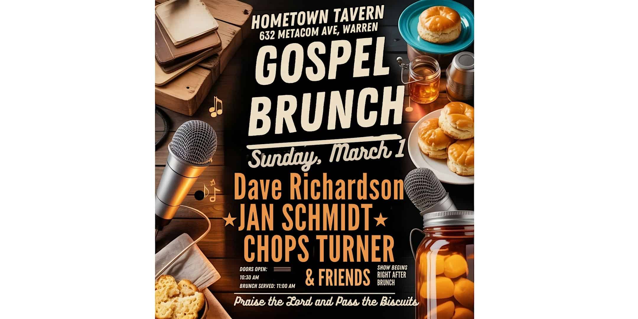 by admin14Feb Gospel Brunch at Hometown Tavern – Warren, RI Gospel Brunch at Hometown Tavern – Warren, RI 1 1 people viewed this event. Join us for a soulful Gospel Brunch filled with uplifting tunes and delicious eats in good company! Tickets-RSVP Link Date And Time Sunday, March 1st, 2026 03:00 PM (PST) Venue Hometown Tavern Location 632 Metacom Avenue, Warren, RI 2885 Event Types Food & Drink Event Category Rhode Island Share With Friends Facebook Twitter Linkedin Xing Pinterest Share This Post: