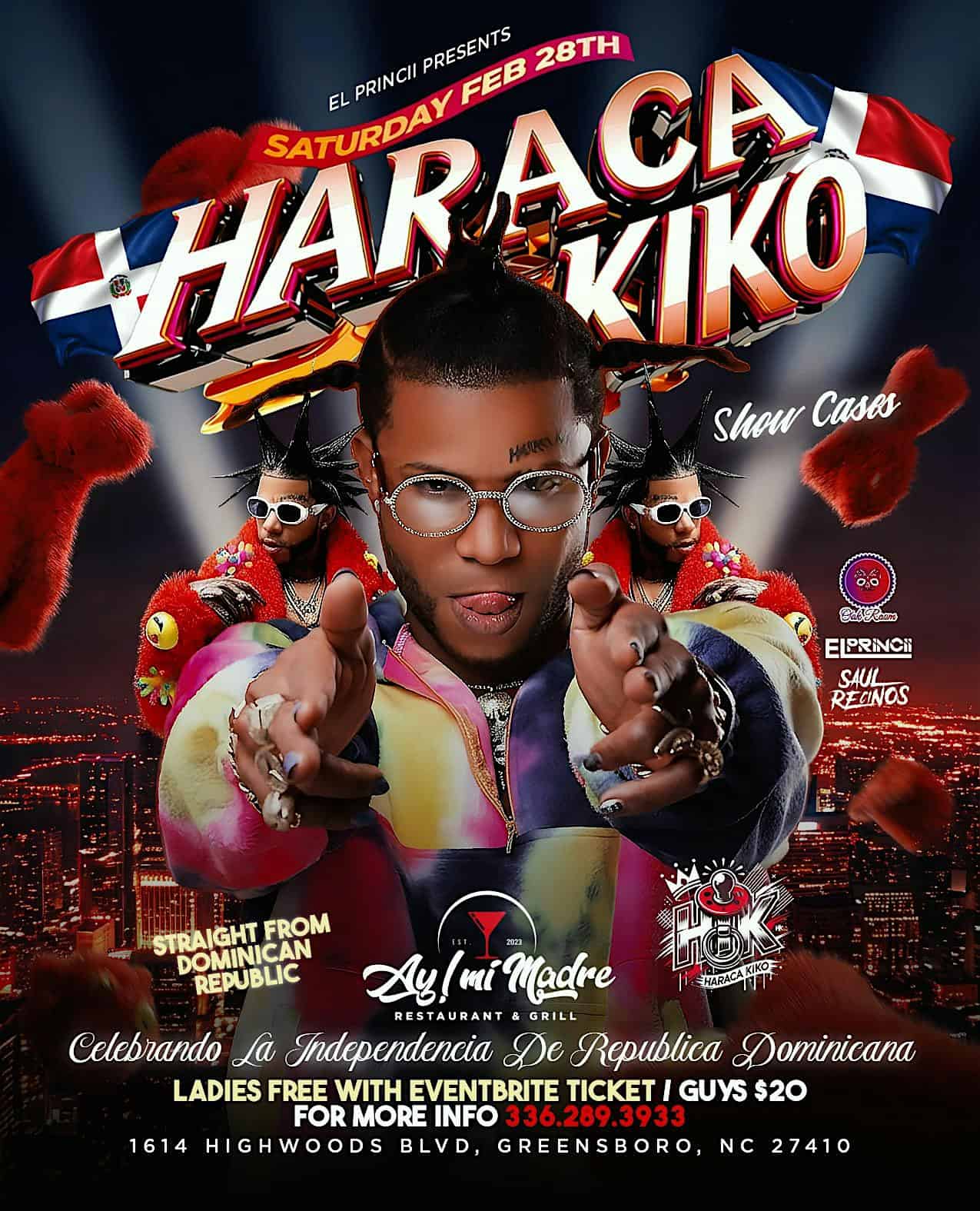 by admin14Feb HARACA KIKO EN VIVO | CELEBRANDO LA INDEPENDENCIA DE REPUBLICA DOMINICANA at AY MI MADRE – Greensboro, NC HARACA KIKO EN VIVO | CELEBRANDO LA INDEPENDENCIA DE REPUBLICA DOMINICANA at AY MI MADRE – Greensboro, NC 2 2 people viewed this event. SABADO 28 DE FEBRERO LLE “HARACA KIKO” POR PRIMERA VEZ A GREENSBORO. Tickets-RSVP Link Date And Time Sunday, March 1st, 2026 02:00 AM (PST) Venue AY MI MADRE Location 1614 Highwoods Blvd, Greensboro, NC 27410 Event Types Community & CultureConcert or Performance Event Category GreensboroNorth Carolina Share With Friends Facebook Twitter Linkedin Xing Pinterest Share This Post: