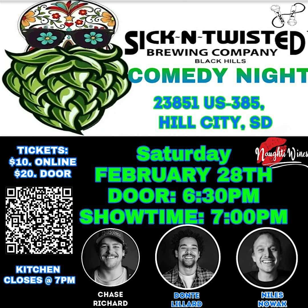 by admin14Feb Hill City Sick-N-Twisted Brewery (Naughti Wines ) at Sick-N-Twisted Brewery – Hill City, SD Hill City Sick-N-Twisted Brewery (Naughti Wines ) at Sick-N-Twisted Brewery – Hill City, SD 3 3 people viewed this event. Join us for a wild and hilarious night at Sick-N-Twisted Brewery (Naughti Wines) Comedy Night, where we’ll serve up laughter and drinks! Tickets-RSVP Link Date And Time Sunday, March 1st, 2026 02:00 AM (PST) Venue Sick-N-Twisted Brewery Location 23851 U.S. 385, Hill City, SD 57745 Event Types Concert or PerformancePerforming & Visual Arts Event Category South Dakota Share With Friends Facebook Twitter Linkedin Xing Pinterest Share This Post: