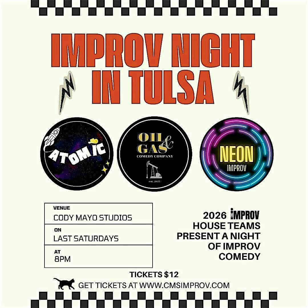 by admin14Feb Improv Night in Tulsa at Cody Mayo Studios – Tulsa, OK Improv Night in Tulsa at Cody Mayo Studios – Tulsa, OK 3 3 people viewed this event. Get ready to laugh out loud & see improv comedy at its finest. This show features professional teams from our CMS improv program! Tickets-RSVP Link Date And Time Sunday, March 1st, 2026 02:00 AM (PST) Venue Cody Mayo Studios Location 317 South Trenton Avenue, Tulsa, OK 74120 Event Types Concert or PerformancePerforming & Visual Arts Event Category OklahomaTulsa Share With Friends Facebook Twitter Linkedin Xing Pinterest Share This Post: