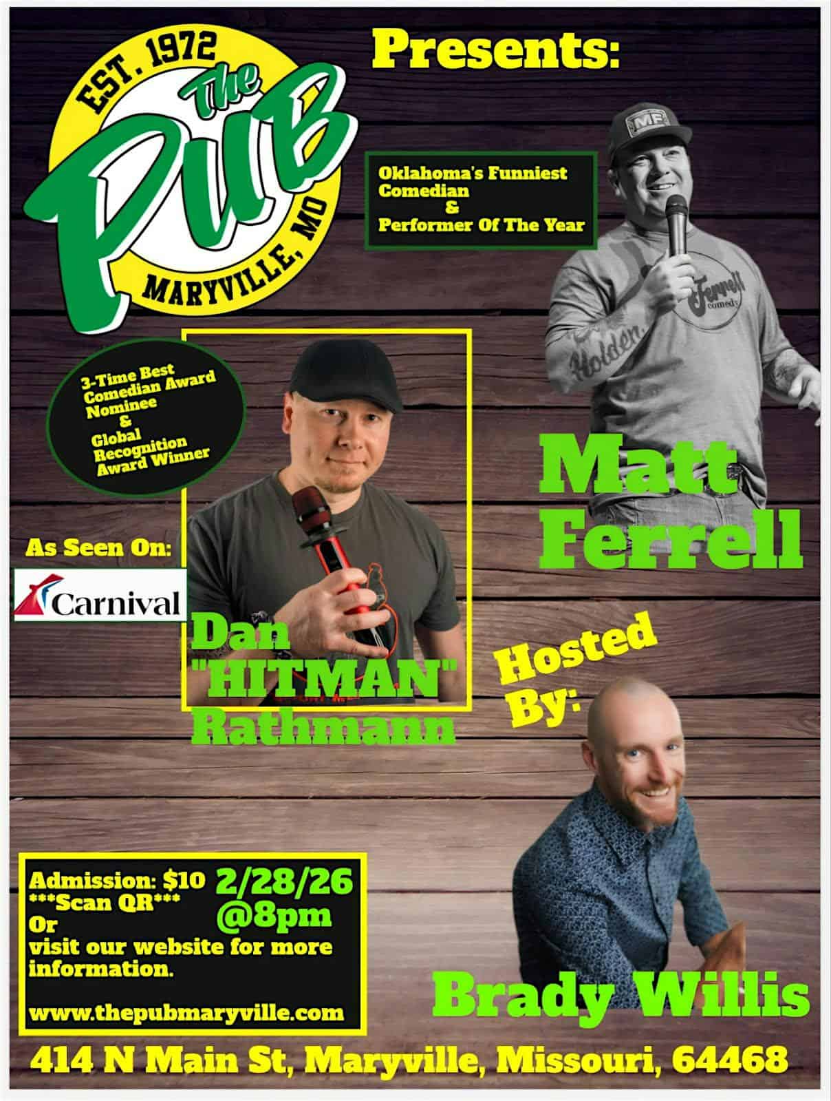 by admin14Feb Matt Ferrell Returns to The Pub Stage! at The Pub – Maryville, MO Matt Ferrell Returns to The Pub Stage! at The Pub – Maryville, MO 2 2 people viewed this event. If you missed Matt last time he was in town you missed one of the funniest people to ever step foot on The Pub Stage. Tickets-RSVP Link Date And Time Sunday, March 1st, 2026 02:00 AM (PST) Venue The Pub Location 414 North Main Street, Maryville, MO 64468 Event Types Concert or PerformancePerforming & Visual Arts Event Category Missouri Share With Friends Facebook Twitter Linkedin Xing Pinterest Share This Post: