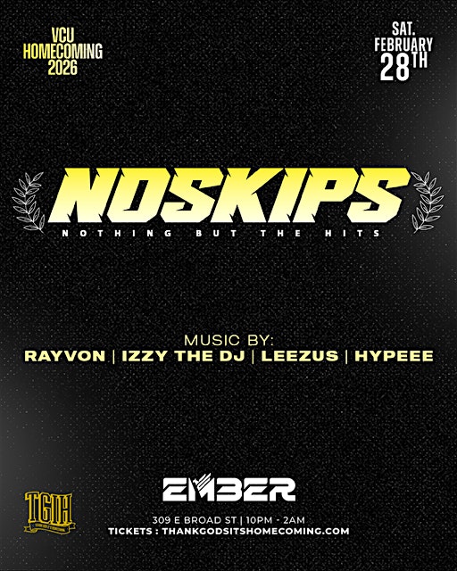 by admin13Feb NO SKIPS : Nothin But The Hits! | VCU Homecoming Finale at Ember Music Hall – Richmond, VA NO SKIPS : Nothin But The Hits! | VCU Homecoming Finale at Ember Music Hall – Richmond, VA 4 4 people viewed this event. Get ready for back to back to back bangers from your Favorite DJ’s! Tickets-RSVP Link Date And Time Sunday, March 1st, 2026 03:00 AM (PST) Venue Ember Music Hall Location 309 East Broad Street, Richmond, VA 23219 Event Types Concert or PerformanceMusic Event Category Virginia Share With Friends Facebook Twitter Linkedin Xing Pinterest Share This Post: