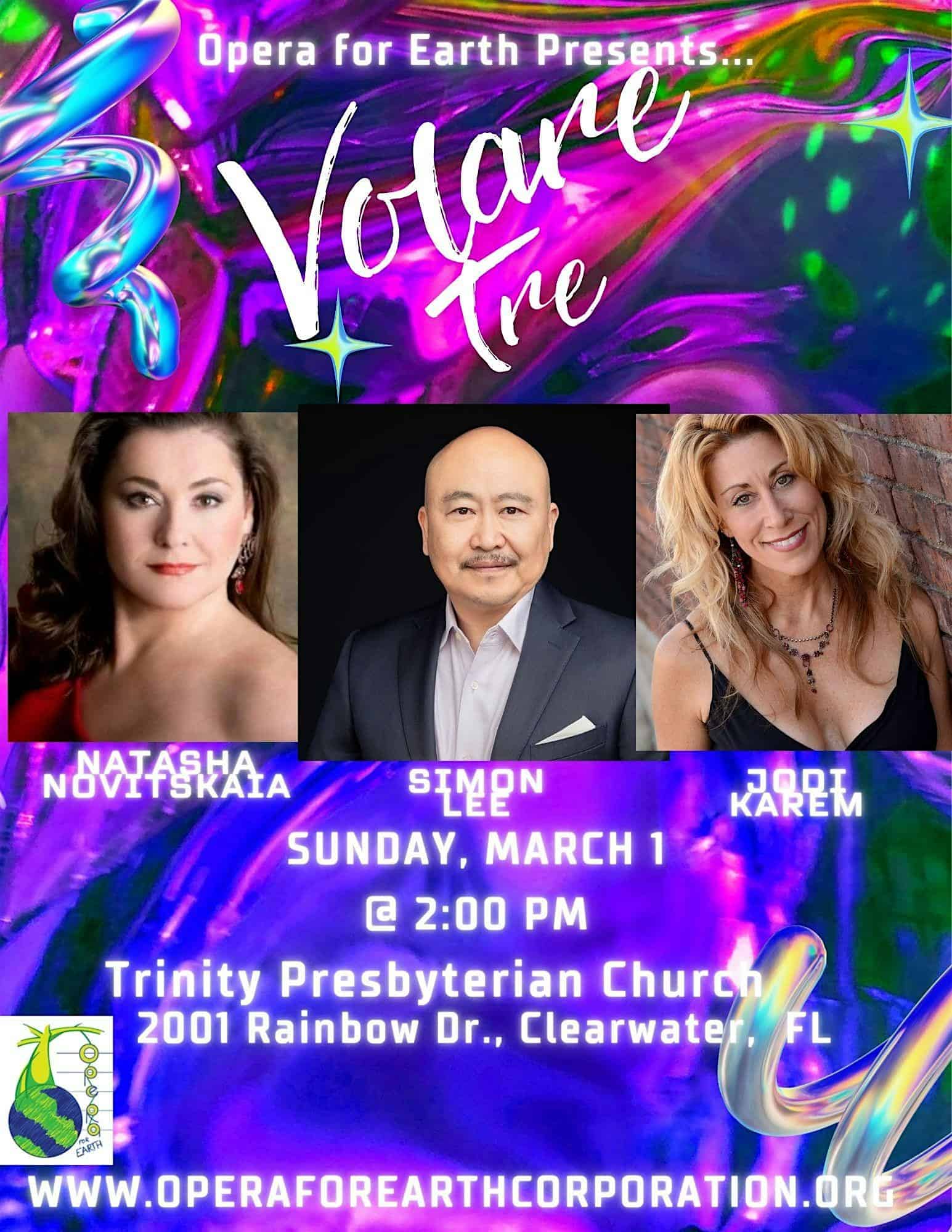 by admin14Feb Opera for Earth Presents…Volare Tre! at Trinity Presbyterian Church – Clearwater, FL Opera for Earth Presents…Volare Tre! at Trinity Presbyterian Church – Clearwater, FL 3 3 people viewed this event. Opera for Earth Presents…Volare Tre! is a live, uplifting night of opera celebrating nature and soaring voices! Tickets-RSVP Link Date And Time Sunday, March 1st, 2026 07:00 PM (PST) Venue Trinity Presbyterian Church Location 2001 Rainbow Drive, Clearwater, FL 33765 Event Types Concert or PerformancePerforming & Visual Arts Event Category FloridaTampa Share With Friends Facebook Twitter Linkedin Xing Pinterest Share This Post: