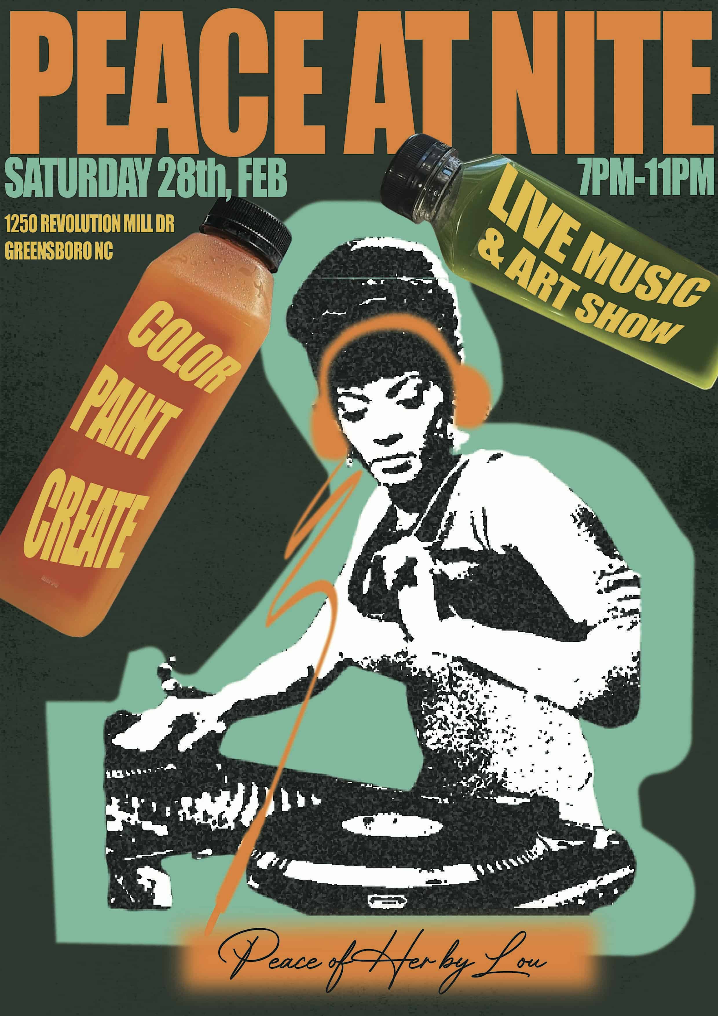 by admin14Feb Peace at Nite | Dj, Art, Food & More at 1250 Revolution Mill Dr #178 – Greensboro, NC Peace at Nite | Dj, Art, Food & More at 1250 Revolution Mill Dr #178 – Greensboro, NC 1 1 people viewed this event. Peace at Nite: live art, music, adult coloring, vendors, food & pure vibes. A creative night of culture & community. ✨ Tickets-RSVP Link Date And Time Sunday, March 1st, 2026 12:00 AM (PST) Venue 1250 Revolution Mill Dr #178 Location 1250 Revolution Mill Drive, Greensboro, NC 27405 Event Types Community & CultureParty or Social Gathering Event Category GreensboroNorth Carolina Share With Friends Facebook Twitter Linkedin Xing Pinterest Share This Post: