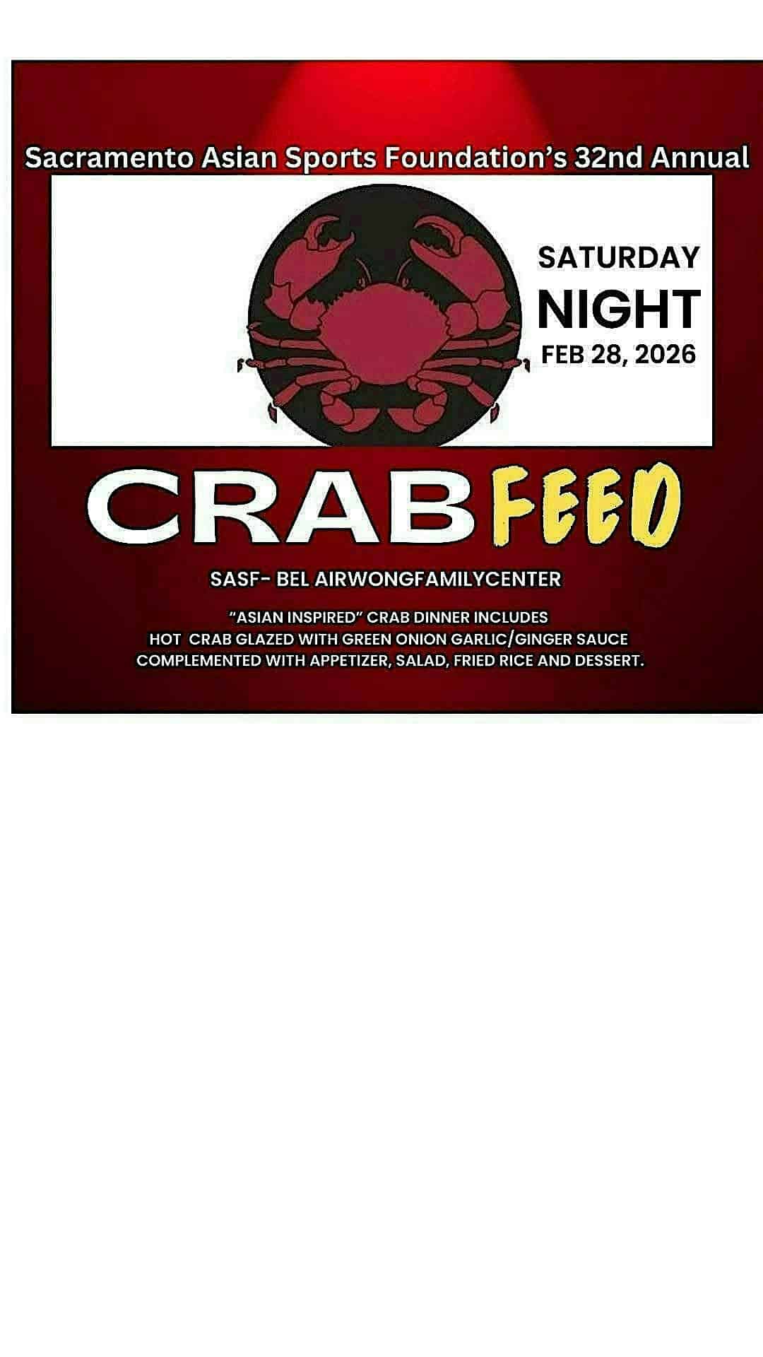 by admin14Feb SASF CRAB FEED at Sacramento Asian Sports Foundation – Elk Grove, CA SASF CRAB FEED at Sacramento Asian Sports Foundation – Elk Grove, CA 2 2 people viewed this event. Get ready to crack some claws and feast on delicious Asian Inspired Crab at the SASF Crab Feed – it’s going to be a shell of a good time! Tickets-RSVP Link Date And Time Sunday, March 1st, 2026 01:00 AM (PST) Venue Sacramento Asian Sports Foundation Location 9040 High Tech Court, Elk Grove, CA 95758 Event Types Food & Drink Event Category CaliforniaSacramento Share With Friends Facebook Twitter Linkedin Xing Pinterest Share This Post: