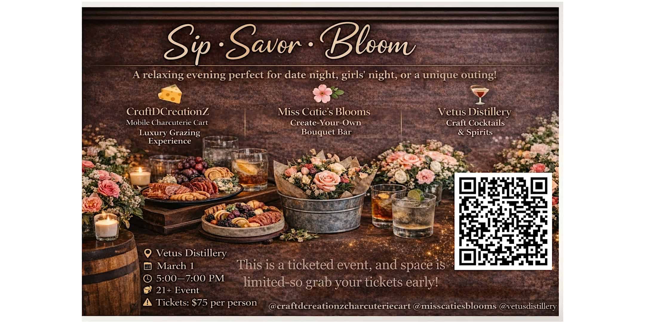 by admin14Feb Sip, Savor, and Bloom at Vetus Distillery – Monroe, NC Sip, Savor, and Bloom at Vetus Distillery – Monroe, NC 1 1 people viewed this event. Join us for Sip, Savor, and Bloom—an epic day of tasty drinks, delicious bites, and blooming good vibes! Tickets-RSVP Link Date And Time Sunday, March 1st, 2026 10:00 PM (PST) Venue Vetus Distillery Location 430 Crow Street, Monroe, NC 28112 Event Types Food & Drink Event Category North Carolina Share With Friends Facebook Twitter Linkedin Xing Pinterest Share This Post: