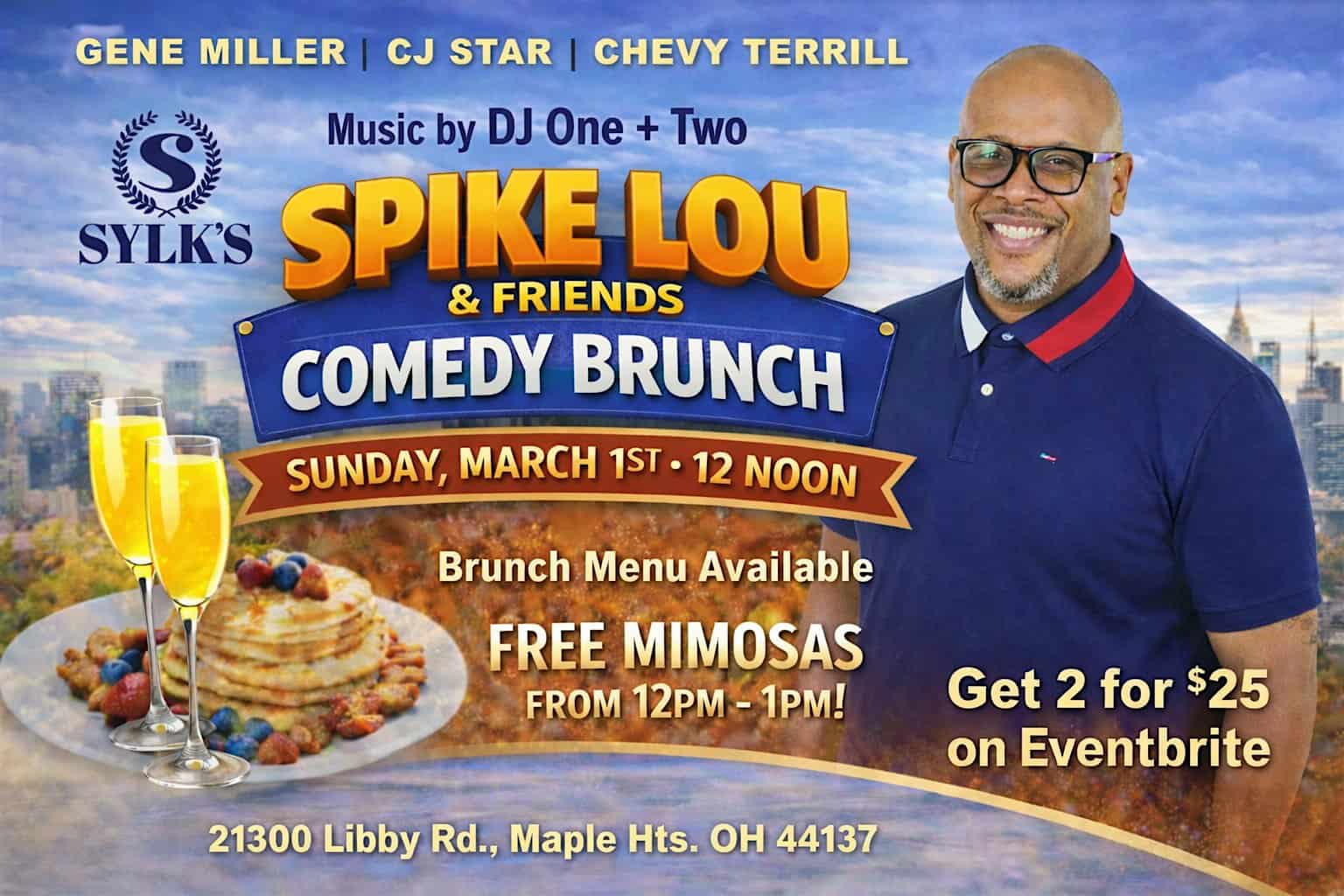 by admin14Feb Spike Lou & Friends Comedy Brunch at 21300 Libby Rd – Maple Heights, OH Spike Lou & Friends Comedy Brunch at 21300 Libby Rd – Maple Heights, OH 2 2 people viewed this event. **FREE MIMOSAS FROM 12PM – 1PM** – Hosted by Spike Lou Tickets-RSVP Link Date And Time Sunday, March 1st, 2026 05:00 PM (PST) Venue 21300 Libby Rd Location 21300 Libby Road, Maple Heights, OH 44137 Event Types Concert or PerformancePerforming & Visual Arts Event Category ClevelandOhio Share With Friends Facebook Twitter Linkedin Xing Pinterest Share This Post: