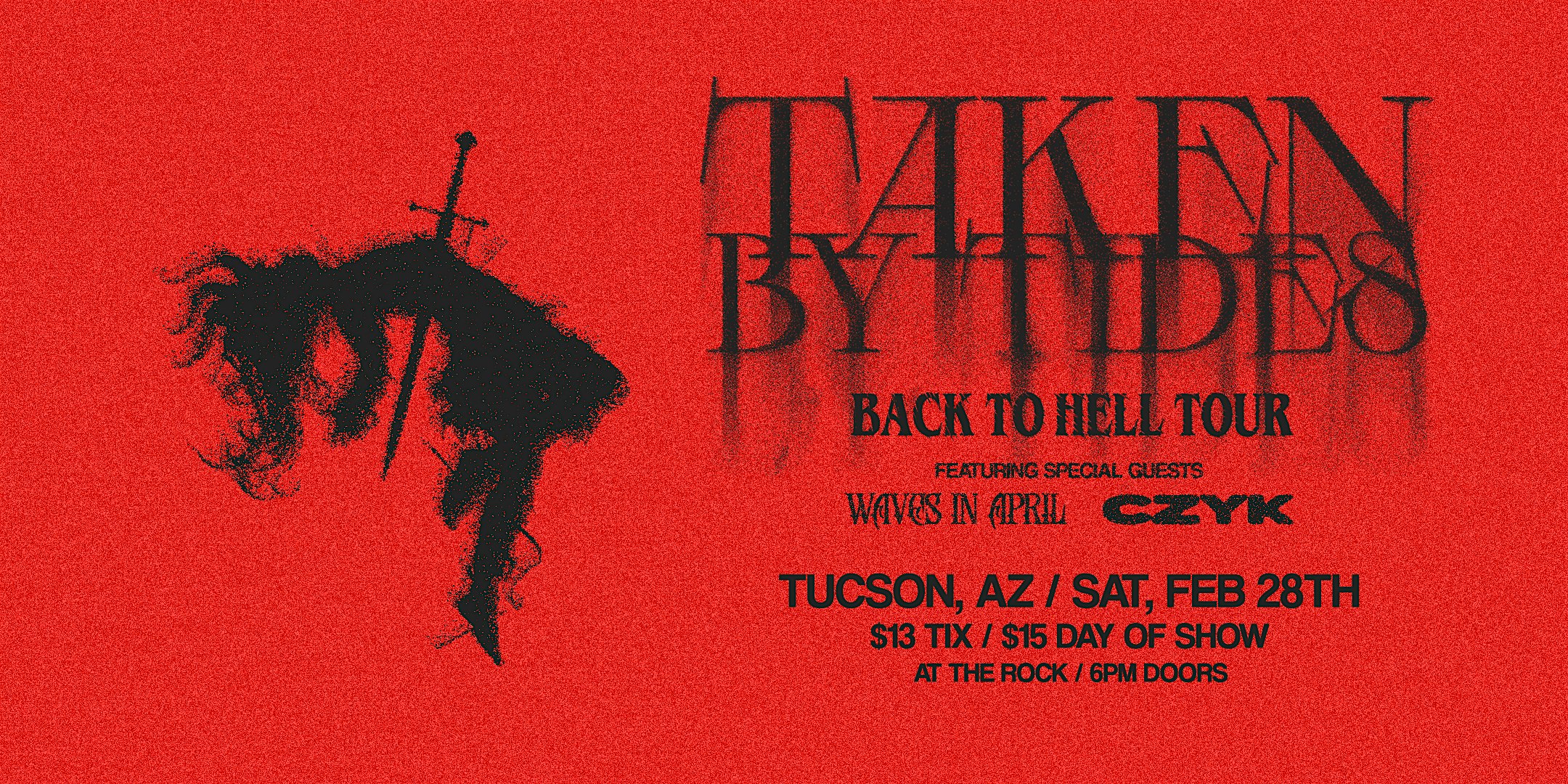 by admin13Feb Taken By Tides / Waves In April / CZYK – TUCSON, AZ at The Rock – Tucson, AZ Taken By Tides / Waves In April / CZYK – TUCSON, AZ at The Rock – Tucson, AZ 2 2 people viewed this event. Taken By Tides goes on their first tour of 2026, followed up after the release of their latest album, Ghost Vibrations. Tickets-RSVP Link Date And Time Sunday, March 1st, 2026 01:00 AM (PST) Venue The Rock Location 136 North Park Avenue, Tucson, AZ 85719 Event Types Concert or PerformanceMusic Event Category ArizonaTucson Share With Friends Facebook Twitter Linkedin Xing Pinterest Share This Post: