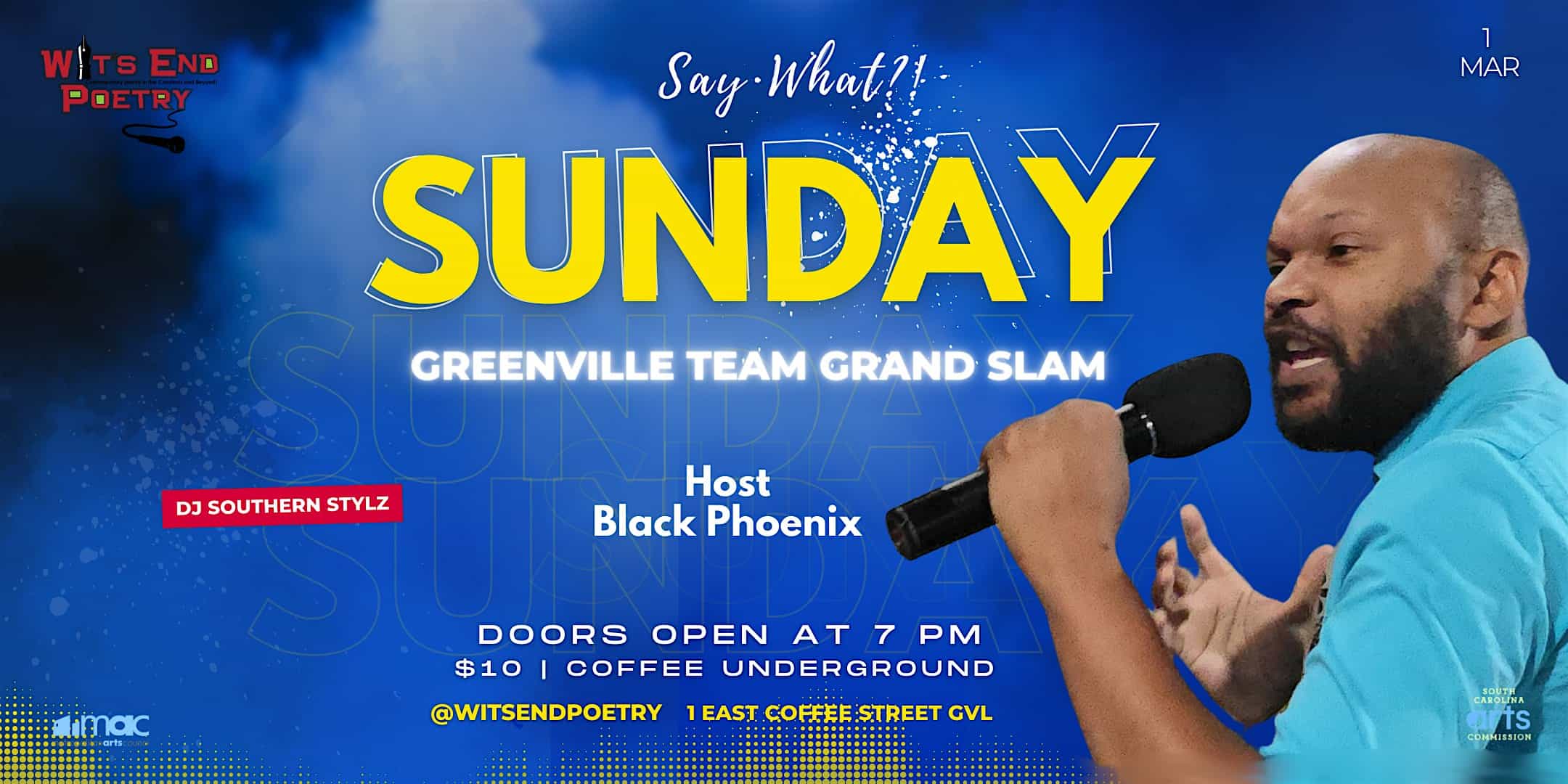 by admin14Feb 2026 Say What?! Greenville Grand Slam for Wits End Poetry at Coffee Underground – Greenville, SC 2026 Say What?! Greenville Grand Slam for Wits End Poetry at Coffee Underground – Greenville, SC 2 2 people viewed this event. Join us for the longest-running poetry showcase in South Carolina, celebrating 20+ years of exciting poetry programming since 2002. Tickets-RSVP Link Date And Time Monday, March 2nd, 2026 12:00 AM (PST) Venue Coffee Underground Location 1 E Coffee St, Greenville, SC 29601 Event Types Concert or PerformancePerforming & Visual Arts Event Category South Carolina Share With Friends Facebook Twitter Linkedin Xing Pinterest Share This Post: