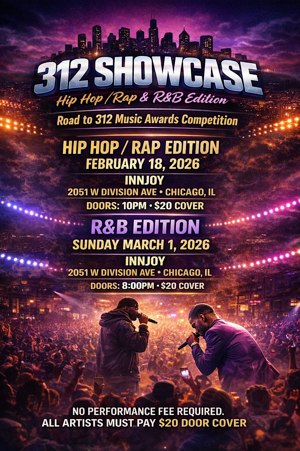 by admin13Feb 312 Showcase 2026 at Innjoy – Chicago, IL 312 Showcase 2026 at Innjoy – Chicago, IL 2 2 people viewed this event. Get ready to witness the hottest talents at the 312 Showcase 2026, where Chicago’s finest artists will light up the stage! Tickets-RSVP Link Date And Time Monday, March 2nd, 2026 02:00 AM (PST) Venue Innjoy Location 2051 West Division Street, Chicago, IL 60622 Event Types Concert or PerformanceMusic Event Category ChicagoIllinois Share With Friends Facebook Twitter Linkedin Xing Pinterest Share This Post: