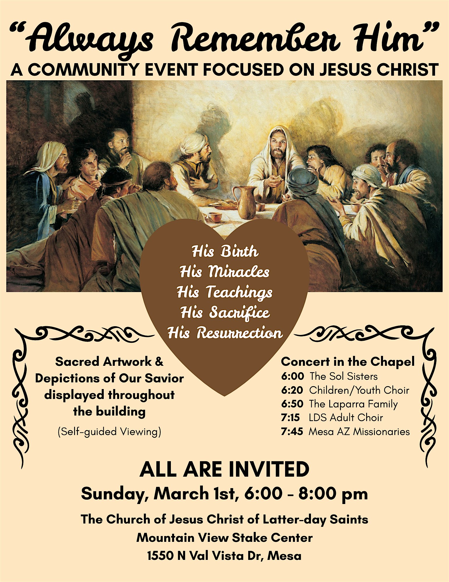 by admin13Feb Always Remember Him: A community event focused on Christ at Mountian View Stake Center – Mesa, AZ Always Remember Him: A community event focused on Christ at Mountian View Stake Center – Mesa, AZ 2 2 people viewed this event. Tickets-RSVP Link Date And Time Monday, March 2nd, 2026 01:00 AM (PST) Venue Mountian View Stake Center Location 1550 N Val Vista Drive, Mesa, AZ 85213 Event Types Music Event Category Arizona Share With Friends Facebook Twitter Linkedin Xing Pinterest Share This Post: