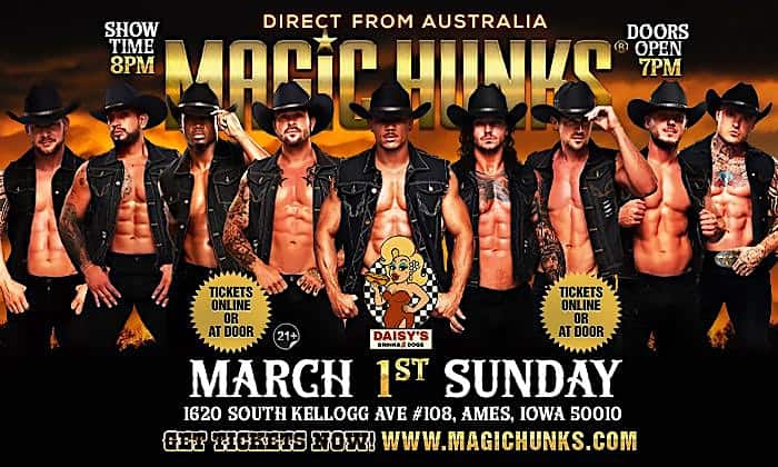 by admin14Feb MAGIC HUNKS AUSTRALIA TAKEOVER AMES,IA USA!!! at Daisy’s Dog House – Ames – Ames, IA MAGIC HUNKS AUSTRALIA TAKEOVER AMES,IA USA!!! at Daisy’s Dog House – Ames – Ames, IA 2 2 people viewed this event. AUSTRALIA’S HOTTEST LADIES NIGHT EVENT IS COMING TO AMES!ROUND UP YOUR PARTY SQUAD FOR THE BEST NIGHT EVER! TICKETS ON SALE NOW! DOORS 7PM Tickets-RSVP Link Date And Time Monday, March 2nd, 2026 02:00 AM (PST) Venue Daisy's Dog House - Ames Location 1620 South Kellogg Avenue, Ames, IA 50010 Event Types Concert or PerformancePerforming & Visual Arts Event Category Iowa Share With Friends Facebook Twitter Linkedin Xing Pinterest Share This Post: