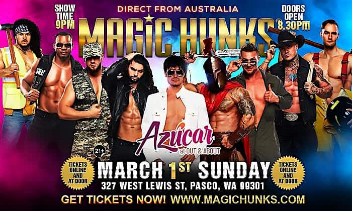 by admin14Feb MAGIC HUNKS AUSTRALIA TAKEOVER PASCO, WA USA!!! at Azucar at Out And About – Pasco, WA MAGIC HUNKS AUSTRALIA TAKEOVER PASCO, WA USA!!! at Azucar at Out And About – Pasco, WA 3 3 people viewed this event. AUSTRALIA’S #1 SHOW IS COMING TO PASCO! ROUND UP YOUR PARTY SQUAD FOR A NIGHT THAT THUNDERS WITH EXCITEMENT! 21+ DOORS 8:30PM Tickets-RSVP Link Date And Time Monday, March 2nd, 2026 05:00 AM (PST) Venue Azucar at Out And About Location 327 West Lewis Street, Pasco, WA 99301 Event Types Concert or PerformancePerforming & Visual Arts Event Category Washington Share With Friends Facebook Twitter Linkedin Xing Pinterest Share This Post: