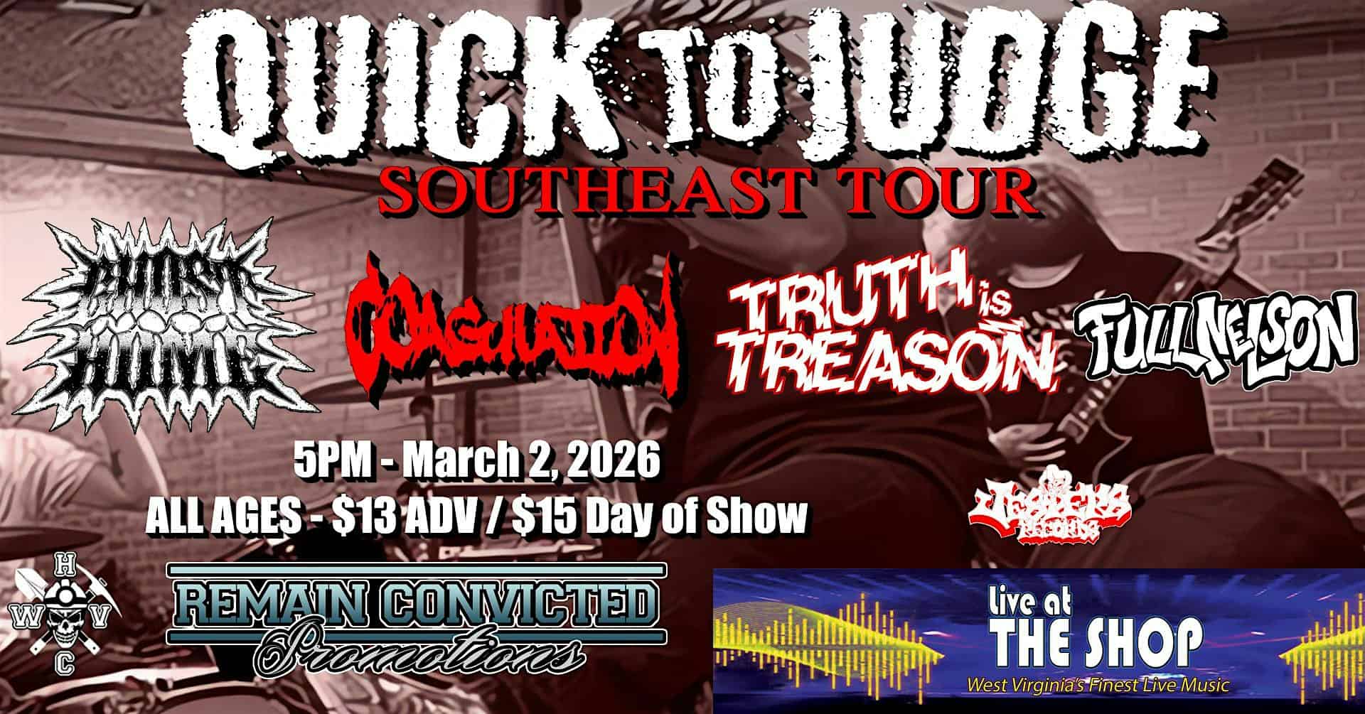 by admin14Feb Quick to Judge Live at the Shop at Live at The Shop – Dunbar, WV Quick to Judge Live at the Shop at Live at The Shop – Dunbar, WV 3 3 people viewed this event. Join us live at the Shop for Quick to Judge with Ghost Home, Full Nelson, Coagulation and Truth is Treason Tickets-RSVP Link Date And Time Monday, March 2nd, 2026 10:00 AM (PST) Venue Live at The Shop Location 1233 Ohio Avenue, Dunbar, WV 25064 Event Types Concert or PerformancePerforming & Visual Arts Event Category West Virginia Share With Friends Facebook Twitter Linkedin Xing Pinterest Share This Post: