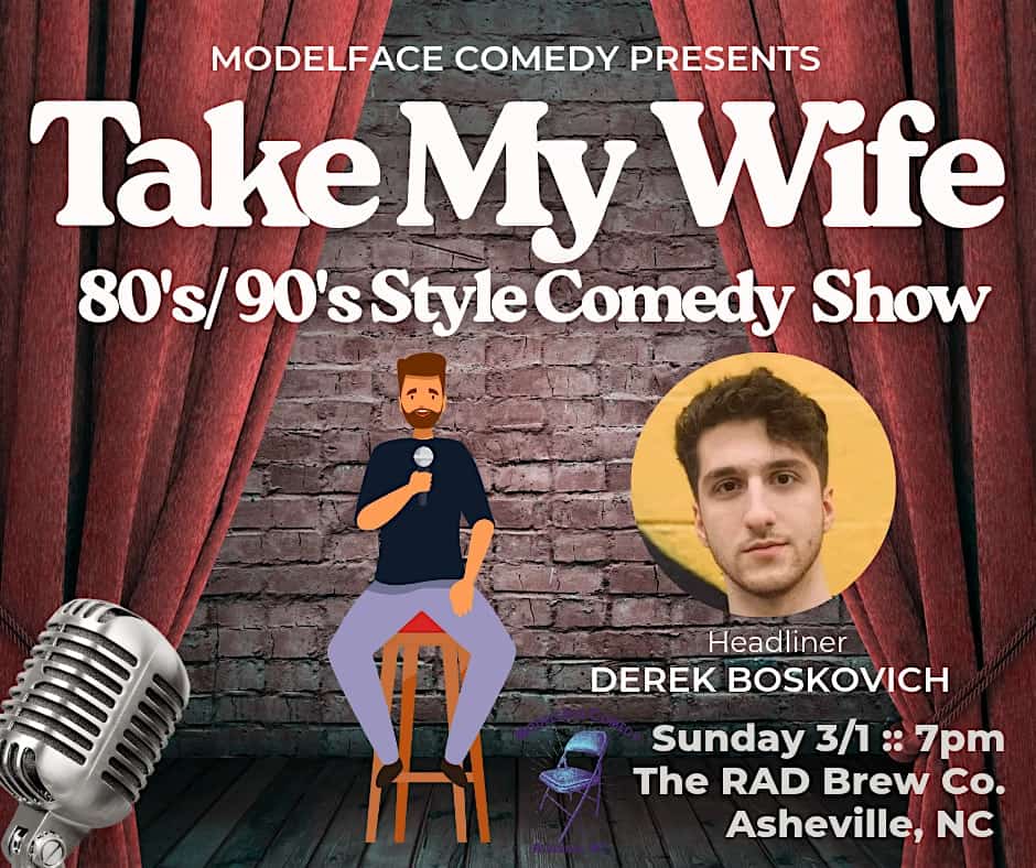 by admin14Feb Take My Wife: 80’s/ 90’s style comedy with Derek Boskovich at The River Arts District Brewing Company (RAD Brewing Co.) – Asheville, NC Take My Wife: 80’s/ 90’s style comedy with Derek Boskovich at The River Arts District Brewing Company (RAD Brewing Co.) – Asheville, NC 2 2 people viewed this event. Every Sunday Funday Modelface Comedy brings the best comedians from all over the country to Asheville, NC Tickets-RSVP Link Date And Time Monday, March 2nd, 2026 12:00 AM (PST) Venue The River Arts District Brewing Company (RAD Brewing Co.) Location 13 Mystery Street, Asheville, NC 28801 Event Types Concert or PerformancePerforming & Visual Arts Event Category North Carolina Share With Friends Facebook Twitter Linkedin Xing Pinterest Share This Post: