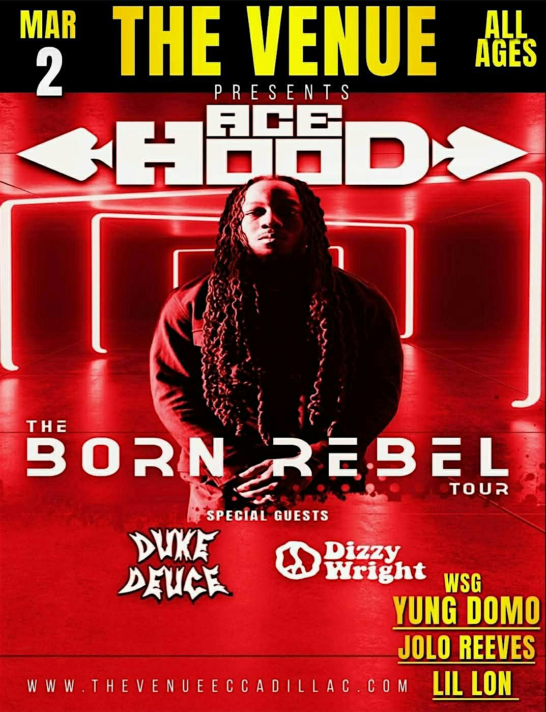 by admin13Feb ACE HOOD wsg DIZZY WRIGHT, DUKE DEUCE, and JOLO REEVES at The Venue Event Center – Cadillac, MI ACE HOOD wsg DIZZY WRIGHT, DUKE DEUCE, and JOLO REEVES at The Venue Event Center – Cadillac, MI 2 2 people viewed this event. Get ready to vibe with ACE HOOD, DIZZY WRIGHT, DUKE DEUCE, and Viral Michigan Artist JOLO REEVES – it’s gonna be lit! Tickets-RSVP Link Date And Time Tuesday, March 3rd, 2026 12:00 AM (PST) Venue The Venue Event Center Location 902 West 13th Street, Cadillac, MI 49601 Event Types Concert or PerformanceMusic Event Category Michigan Share With Friends Facebook Twitter Linkedin Xing Pinterest Share This Post: