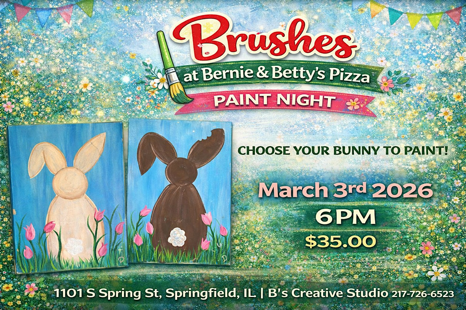 by admin27Feb Brushes at Bernie & Bettys-Spring Bunny at Bernie & Betty’s Pizza – Springfield, IL Brushes at Bernie & Bettys-Spring Bunny at Bernie & Betty’s Pizza – Springfield, IL 5 5 people viewed this event. Come have fun painting with Dara From B’s Creative Studio at Bernie & Betty’s Tickets-RSVP Link Date And Time Tuesday, March 3rd, 2026 @ 06:00 PM Location 1101 South Spring Street, Springfield, IL 62704 Event Types Party or Social Gathering Event Category Illinois Share With Friends Facebook Twitter Linkedin Xing Pinterest Share This Post: