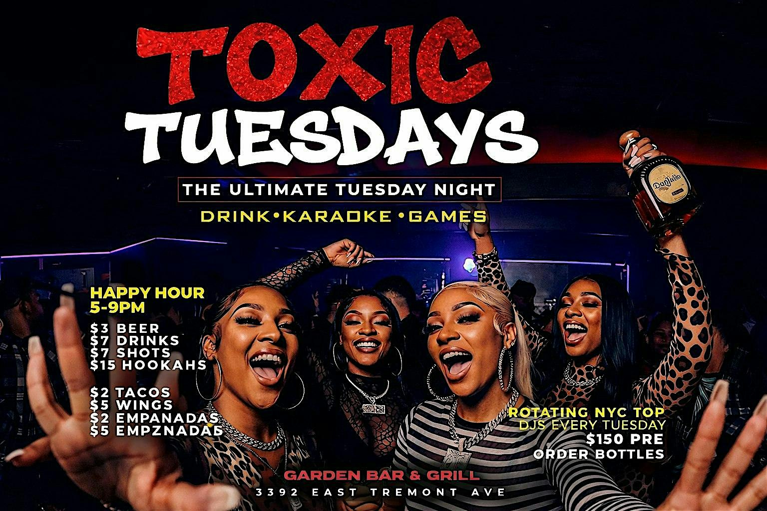 by admin27Feb Toxic Tuesday @ Garden Bar & Grill at Garden Bar & Grill – The Bronx, NY Toxic Tuesday @ Garden Bar & Grill at Garden Bar & Grill – The Bronx, NY 1 1 people viewed this event. “Toxic Tuesdays” is a high-energy weekly party at Garden Bar & Grill featuring drinks, karaoke, games, rotating NYC DJs, and happy hour. Tickets-RSVP Link Date And Time Tuesday, March 3rd, 2026 05:00 PM (PST) Venue Garden Bar & Grill Location 3392 East Tremont Avenue, The Bronx, NY 10461 Event Types MusicParty or Social Gathering Event Category New YorkNew York City Share With Friends Facebook Twitter Linkedin Xing Pinterest Share This Post: