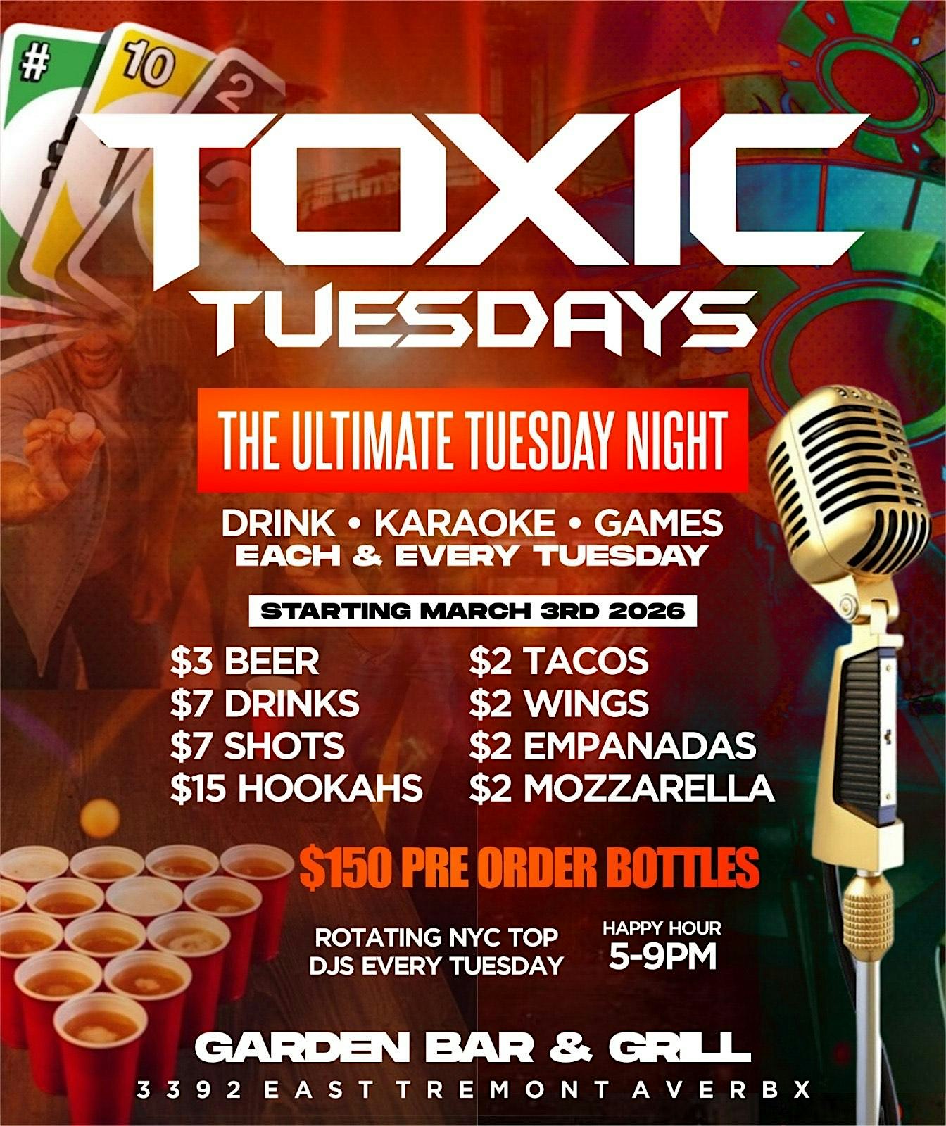 by admin13Feb Toxic Tuesdays At Garden Bar & Grill at Garden Bar & Grill – The Bronx, NY Toxic Tuesdays At Garden Bar & Grill at Garden Bar & Grill – The Bronx, NY 1 1 people viewed this event. Get ready to kick off your week with a bang at Garden Bar & Grill – Toxic Tuesdays promise a wild night you wont forget! Drink*Karaoke*Games Tickets-RSVP Link Date And Time Tuesday, March 3rd, 2026 10:00 PM (PST) Venue Garden Bar & Grill Location 3392 East Tremont Avenue, The Bronx, NY 10461 Event Types Food & DrinkParty or Social Gathering Event Category New YorkNew York City Share With Friends Facebook Twitter Linkedin Xing Pinterest Share This Post: