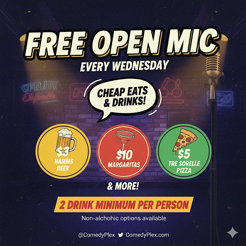 by admin27Feb FREE Open Mic Comedy & Tre Sorrelle Coffee at Comedy Plex Comedy Club – Oak Park, IL FREE Open Mic Comedy & Tre Sorrelle Coffee at Comedy Plex Comedy Club – Oak Park, IL 4 4 people viewed this event. Free laughs & free coffee at Comedy Plex! $3 Hamms, $10 Margaritas & $5 Tre Sorelle pizza. Every Wed. 2-DRINK MIN.. See you underground! Tickets-RSVP Link Date And Time Wednesday, March 4th, 2026 @ 08:00 PM Location 1128 Lake Street, Oak Park, IL 60301 Event Types Party or Social GatheringPerforming & Visual Arts Event Category Illinois Share With Friends Facebook Twitter Linkedin Xing Pinterest Share This Post: