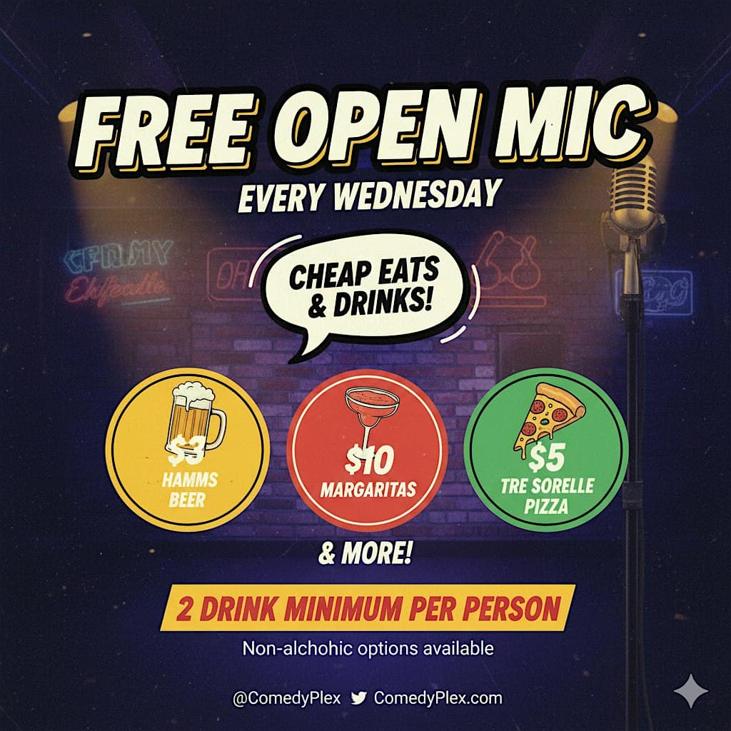 by admin23Feb FREE Open Mic Comedy & Tre Sorrelle Coffee at Comedy Plex Comedy Club – Oak Park, IL FREE Open Mic Comedy & Tre Sorrelle Coffee at Comedy Plex Comedy Club – Oak Park, IL 3 3 people viewed this event. Free laughs & free coffee at Comedy Plex! $3 Hamms, $10 Margaritas & $5 Tre Sorelle pizza. Every Wed. 2-DRINK MIN.. See you underground! Tickets-RSVP Link Date And Time Wednesday, March 4th, 2026 @ 08:00 PM Location 1128 Lake Street, Oak Park, IL 60301 Event Types Party or Social GatheringPerforming & Visual Arts Event Category Illinois Share With Friends Facebook Twitter Linkedin Xing Pinterest Share This Post: