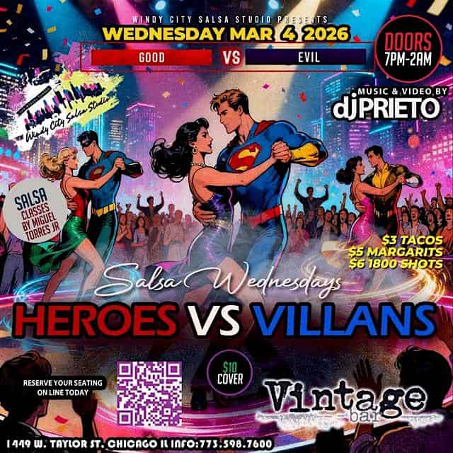 by admin23Feb Heroes vs. Villains – Salsa Wednesday @ Vintage Bar at Vintage Bar – Chicago, IL Heroes vs. Villains – Salsa Wednesday @ Vintage Bar at Vintage Bar – Chicago, IL 2 2 people viewed this event. Windy City Salsa Studio Presents: Heroes vs. Villains – Salsa Wednesday @ Vintage Bar Tickets-RSVP Link Date And Time Wednesday, March 4th, 2026 07:00 PM (PST) Venue Vintage Bar Location 1449 West Taylor Street, Chicago, IL 60607 Event Types Food & DrinkParty or Social Gathering Event Category ChicagoIllinois Share With Friends Facebook Twitter Linkedin Xing Pinterest Share This Post: