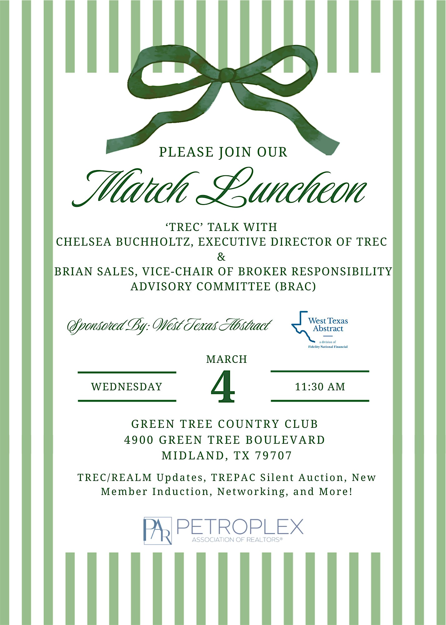 by admin23Feb March Luncheon at Green Tree Country Club – Midland, TX March Luncheon at Green Tree Country Club – Midland, TX 2 2 people viewed this event. Join us for our March Luncheon! Thank you luncheon sponsor, West Texas Abstract! Tickets-RSVP Link Date And Time Wednesday, March 4th, 2026 11:00 AM (PST) Venue Green Tree Country Club Location 4900 Green Tree Boulevard, Midland, TX 79707 Event Types Food & Drink Event Category Texas Share With Friends Facebook Twitter Linkedin Xing Pinterest Share This Post:
