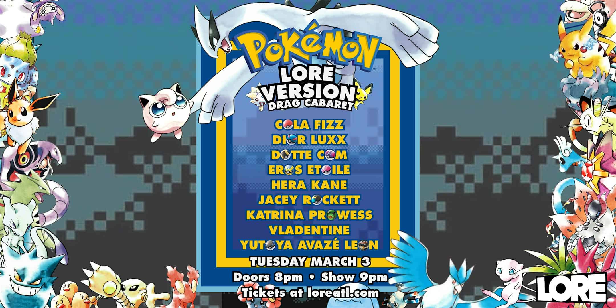 by admin14Feb Pokemon Drag Cabaret (LORE Version) at Lore – Atlanta, GA Pokemon Drag Cabaret (LORE Version) at Lore – Atlanta, GA 2 2 people viewed this event. Calling all Pokemon Masters! Tickets-RSVP Link Date And Time Wednesday, March 4th, 2026 01:00 AM (PST) Venue Lore Location 466 Edgewood Avenue Southeast, Atlanta, GA 30312 Event Types Community & CultureConcert or Performance Event Category AtlantaGeorgia Share With Friends Facebook Twitter Linkedin Xing Pinterest Share This Post: