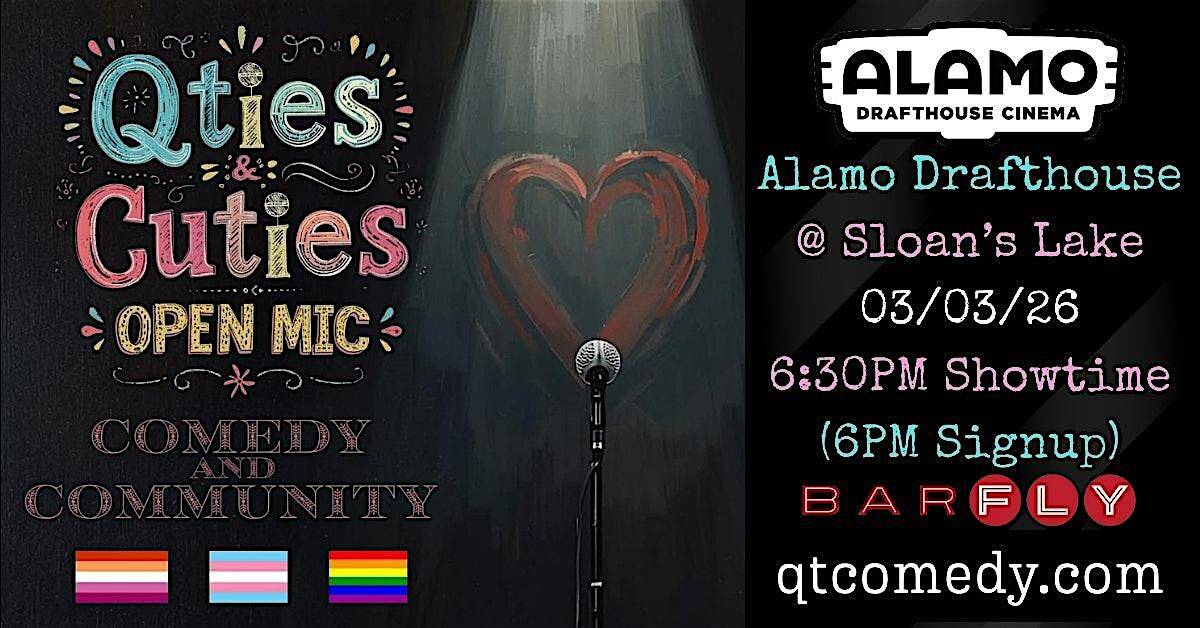 by admin14Feb QTs & Cuties: A Comedy Open Mic Safe Space at Alamo Drafthouse Cinema Sloans Lake – Denver, CO QTs & Cuties: A Comedy Open Mic Safe Space at Alamo Drafthouse Cinema Sloans Lake – Denver, CO 2 2 people viewed this event. Have you been looking for a comedy event that is catered to a crowd of queer folks and women? You’ve found it! Tickets-RSVP Link Date And Time Wednesday, March 4th, 2026 01:00 AM (PST) Venue Alamo Drafthouse Cinema Sloans Lake Location 4255 West Colfax Avenue, Denver, CO 80204 Event Types Concert or PerformancePerforming & Visual Arts Event Category ColoradoDenver Share With Friends Facebook Twitter Linkedin Xing Pinterest Share This Post: