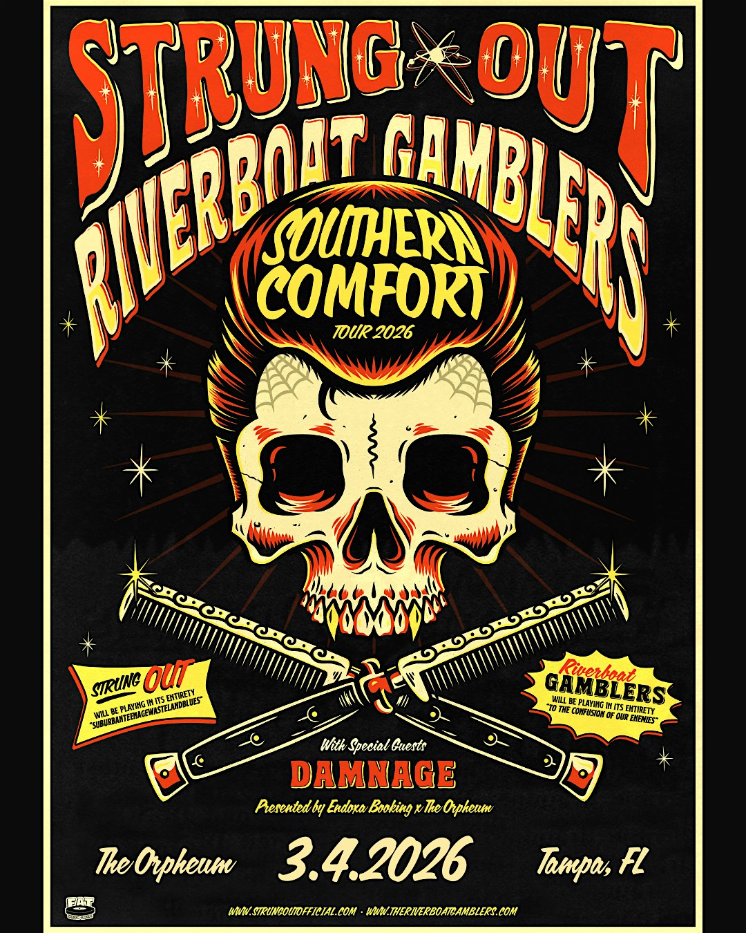 by admin13Feb Strung Out and Riverboat Gamblers at The Orpheum – Tampa, FL Strung Out and Riverboat Gamblers at The Orpheum – Tampa, FL 1 1 people viewed this event. Come see Strung Out and Riverboat Gamblers @ The Orpheum Tampa Florida, on Wednesday March 4th 2026! Tickets-RSVP Link Date And Time Wednesday, March 4th, 2026 11:00 PM (PST) Venue The Orpheum Location 14802 North Nebraska Avenue, Tampa, FL 33613 Event Types Concert or PerformanceMusic Event Category FloridaTampa Share With Friends Facebook Twitter Linkedin Xing Pinterest Share This Post: