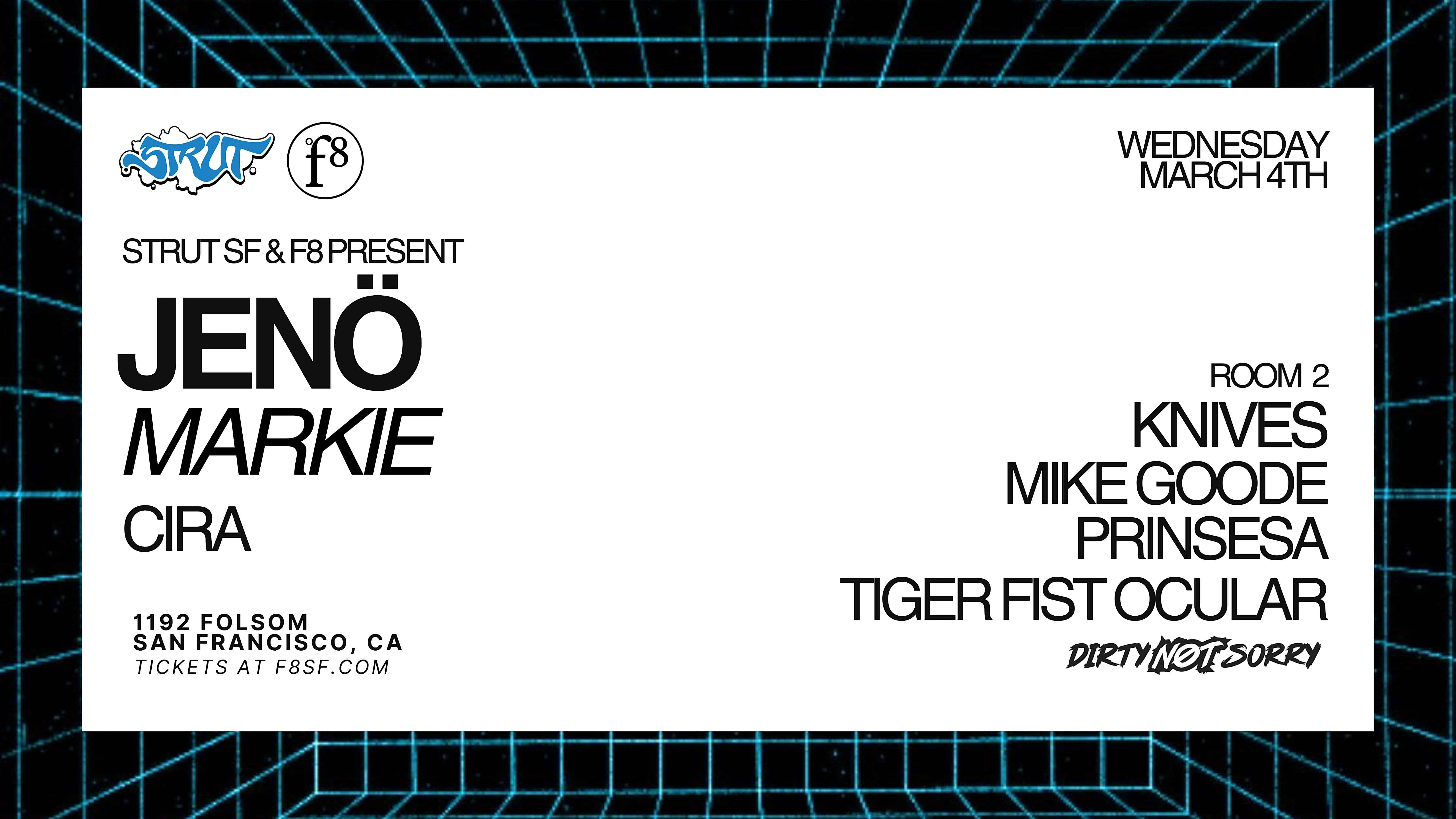 by admin23Feb STRUT SF & F8 Present Jenö & Markie at F8 Nightclub & Bar – San Francisco, CA STRUT SF & F8 Present Jenö & Markie at F8 Nightclub & Bar – San Francisco, CA 2 2 people viewed this event. Wednesday, March 4th Strut SF welcomes Jenö & Markie, two pioneers who helped shape West Coast rave culture, for a special night at F8 Tickets-RSVP Link Date And Time Wednesday, March 4th, 2026 09:00 PM (PST) Venue F8 Nightclub & Bar Location 1192 Folsom Street, San Francisco, CA 94103 Event Types Concert or PerformanceMusic Event Category CaliforniaSan Francisco Share With Friends Facebook Twitter Linkedin Xing Pinterest Share This Post: