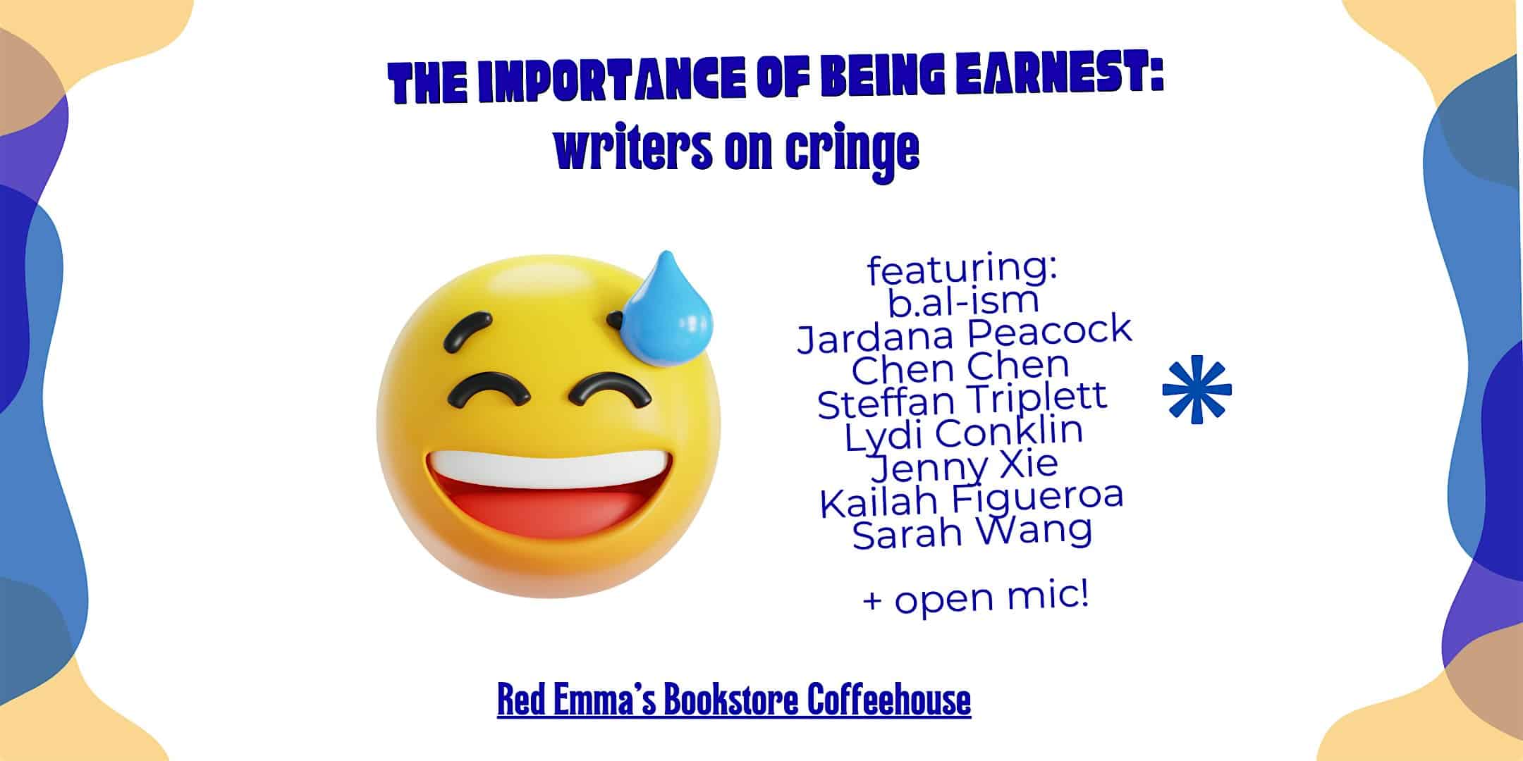 by admin14Feb The importance of being earnest: writers on cringe at Red Emma’s Bookstore Coffeehouse – Baltimore, MD The importance of being earnest: writers on cringe at Red Emma’s Bookstore Coffeehouse – Baltimore, MD 2 2 people viewed this event. Giggle, groan, get teary eyed and feel all the feels at this reading of writers embracing everything earnest. Tickets-RSVP Link Date And Time Wednesday, March 4th, 2026 10:00 PM (PST) Venue Red Emma's Bookstore Coffeehouse Location 3128 Greenmount Avenue, Baltimore, MD 21218 Event Types Community & CultureConcert or Performance Event Category BaltimoreMaryland Share With Friends Facebook Twitter Linkedin Xing Pinterest Share This Post:
