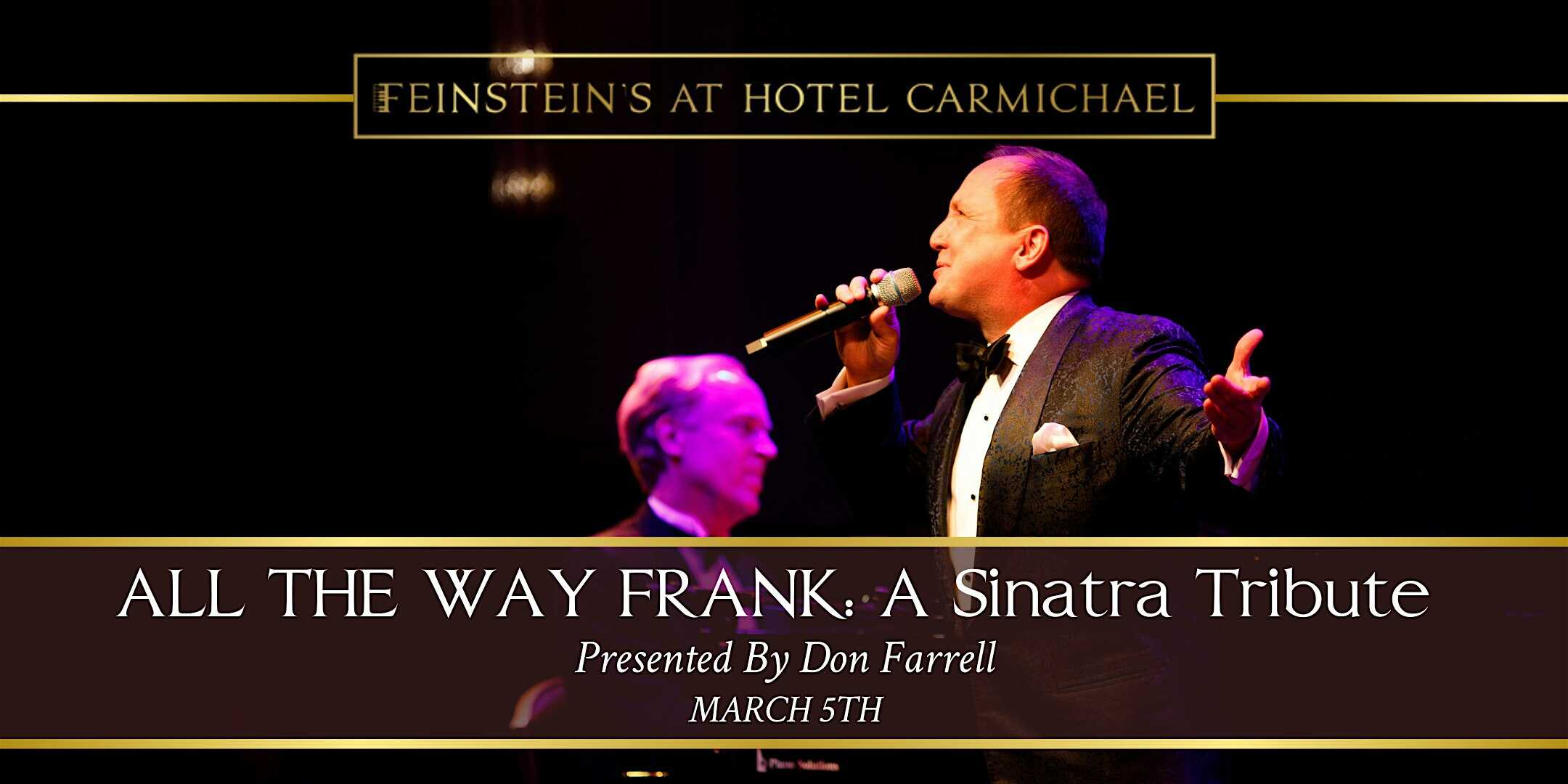 by admin23Feb ALL THE WAY FRANK: A SINATRA TRIBUTE at Feinstein’s at Hotel Carmichael – Carmel, IN ALL THE WAY FRANK: A SINATRA TRIBUTE at Feinstein’s at Hotel Carmichael – Carmel, IN 2 2 people viewed this event. The Indy Star’s Nick Crews says, “From Farrell, these songs go down like a smooth martini.” “Bottom Line: Like Frank: Top of the Heap.” Tickets-RSVP Link Date And Time Thursday, March 5th, 2026 07:00 PM (PST) Venue Feinstein's at Hotel Carmichael Location 1 Carmichael Square, Carmel, IN 46032 Event Types Concert or PerformanceMusic Event Category Indiana Share With Friends Facebook Twitter Linkedin Xing Pinterest Share This Post: