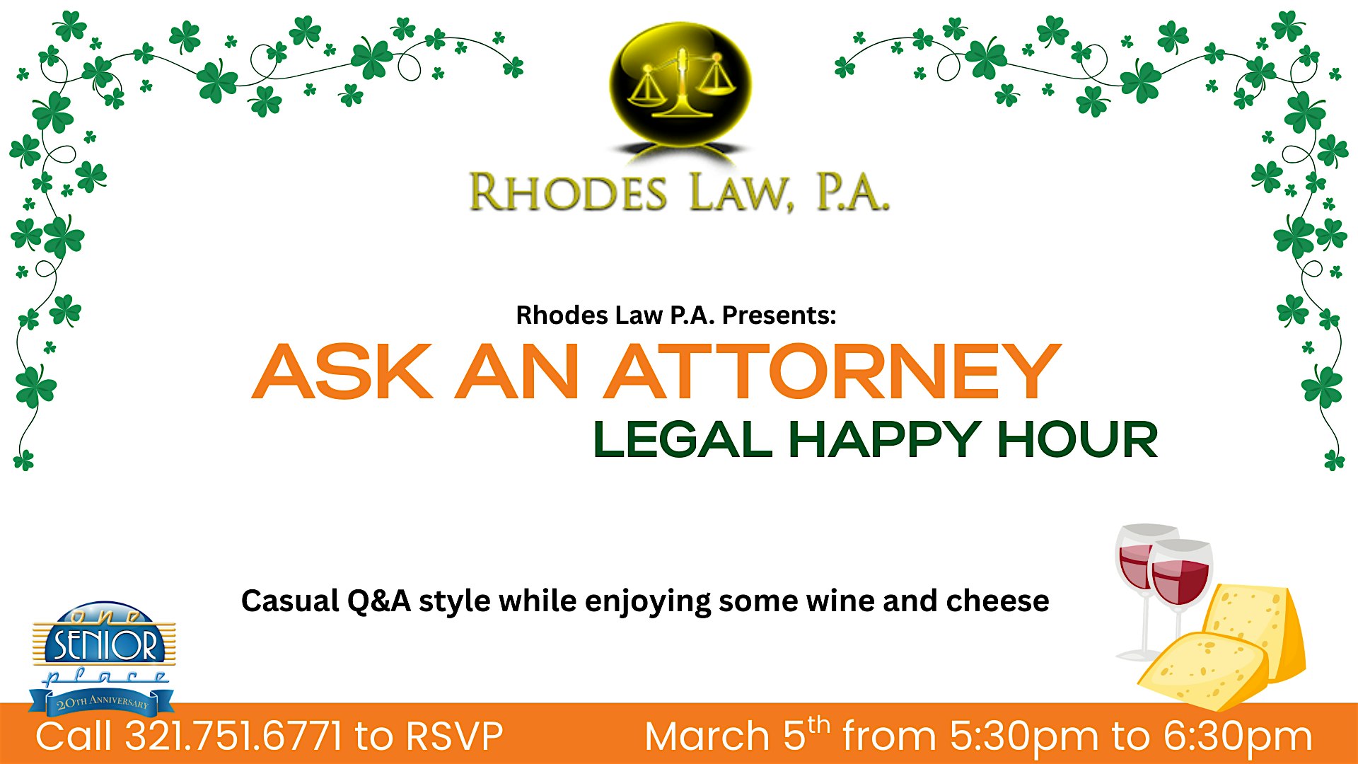 by admin27Feb Ask An Attorney – Legal Happy Hour at One Senior Place – Melbourne, FL Ask An Attorney – Legal Happy Hour at One Senior Place – Melbourne, FL 2 2 people viewed this event. Ask an attorney your legal questions over cocktails & appetizers. Wills, probate, Medicaid & more. Tickets-RSVP Link Date And Time Thursday, March 5th, 2026 05:00 PM (PST) Venue One Senior Place Location 8085 Spyglass Hill Road, Melbourne, FL 32940 Event Types Food & Drink Event Category Florida Share With Friends Facebook Twitter Linkedin Xing Pinterest Share This Post: