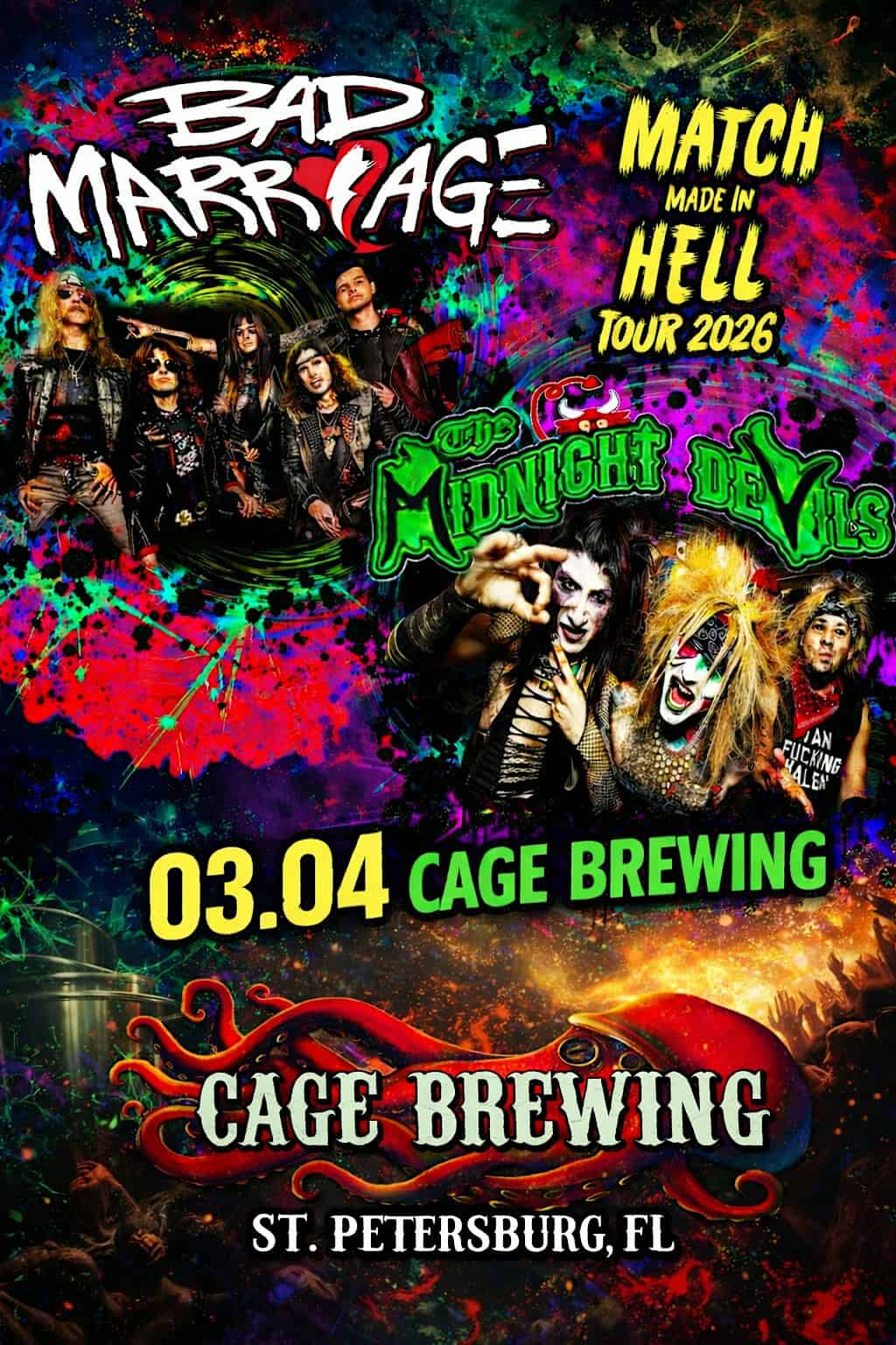 by admin14Feb Bad Marriage(ft. Tommy Skeoch of TESLA) & The Midnight Devils | St. Pete FL at Cage Brewing – St. Petersburg, FL Bad Marriage(ft. Tommy Skeoch of TESLA) & The Midnight Devils | St. Pete FL at Cage Brewing – St. Petersburg, FL 2 2 people viewed this event. Catch Bad Marriage & The Midnight Devils rock the stage live at Cage Brewing in St. Pete—epic night awaits.. ft. Tommy Skeoch of TESLA! Tickets-RSVP Link Date And Time Thursday, March 5th, 2026 01:00 AM (PST) Venue Cage Brewing Location 2001 1st Avenue South, St. Petersburg, FL 33712 Event Types Concert or PerformanceMusic Event Category Florida Share With Friends Facebook Twitter Linkedin Xing Pinterest Share This Post: