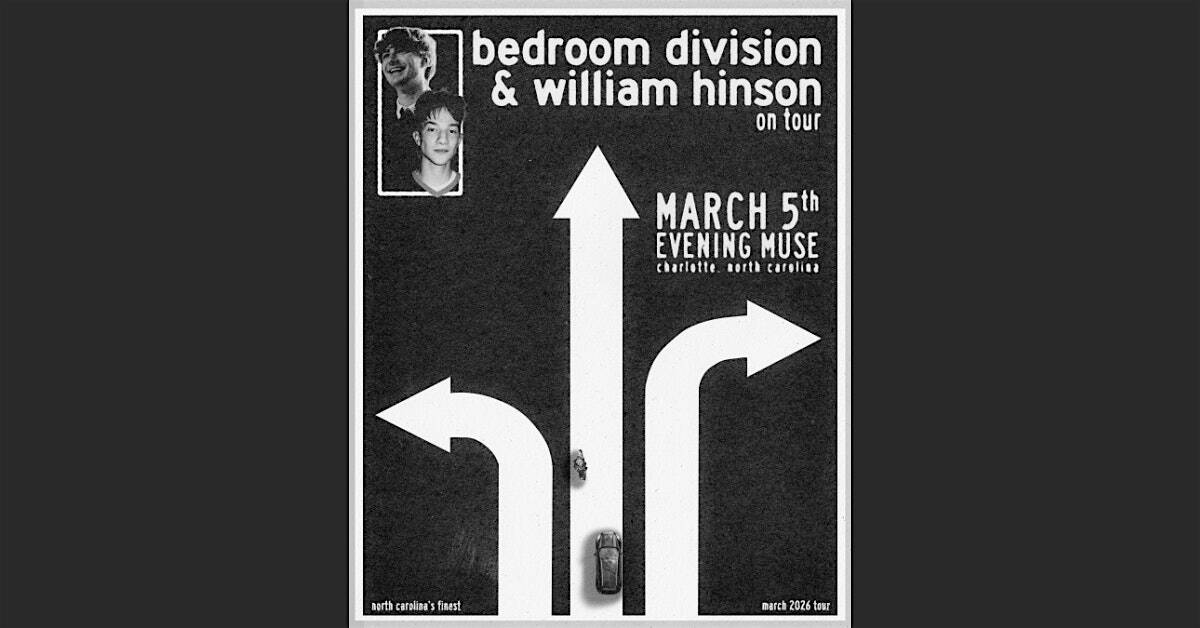by admin23Feb Bedroom Division and William Hinson Tour at The Evening Muse – Charlotte, NC Bedroom Division and William Hinson Tour at The Evening Muse – Charlotte, NC 3 3 people viewed this event. Bedroom Division and William Hinson Tour Tickets-RSVP Link Date And Time Thursday, March 5th, 2026 07:00 PM (PST) Venue The Evening Muse Location 3227 N. Davidson Street, Charlotte, NC 28205 Event Types Concert or PerformanceMusic Event Category CharlotteNorth Carolina Share With Friends Facebook Twitter Linkedin Xing Pinterest Share This Post: