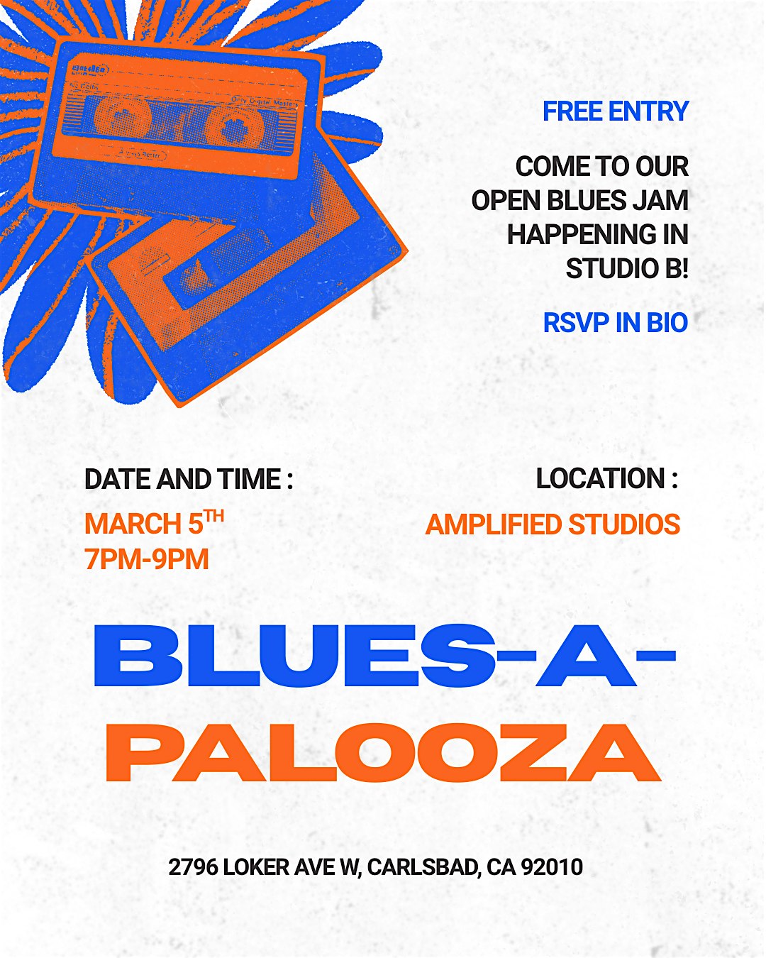 by admin27Feb Blues-A-Palooza (Blues Jam) FREE Event! at 2796 Loker Ave W suite 102 – Carlsbad, CA Blues-A-Palooza (Blues Jam) FREE Event! at 2796 Loker Ave W suite 102 – Carlsbad, CA 2 2 people viewed this event. Come jam the blues with us on March 5th! Tickets-RSVP Link Date And Time Thursday, March 5th, 2026 07:00 PM (PST) Venue 2796 Loker Ave W suite 102 Location 2796 Loker Avenue West, Carlsbad, CA 92010 Event Types Concert or PerformanceMusic Event Category California Share With Friends Facebook Twitter Linkedin Xing Pinterest Share This Post: