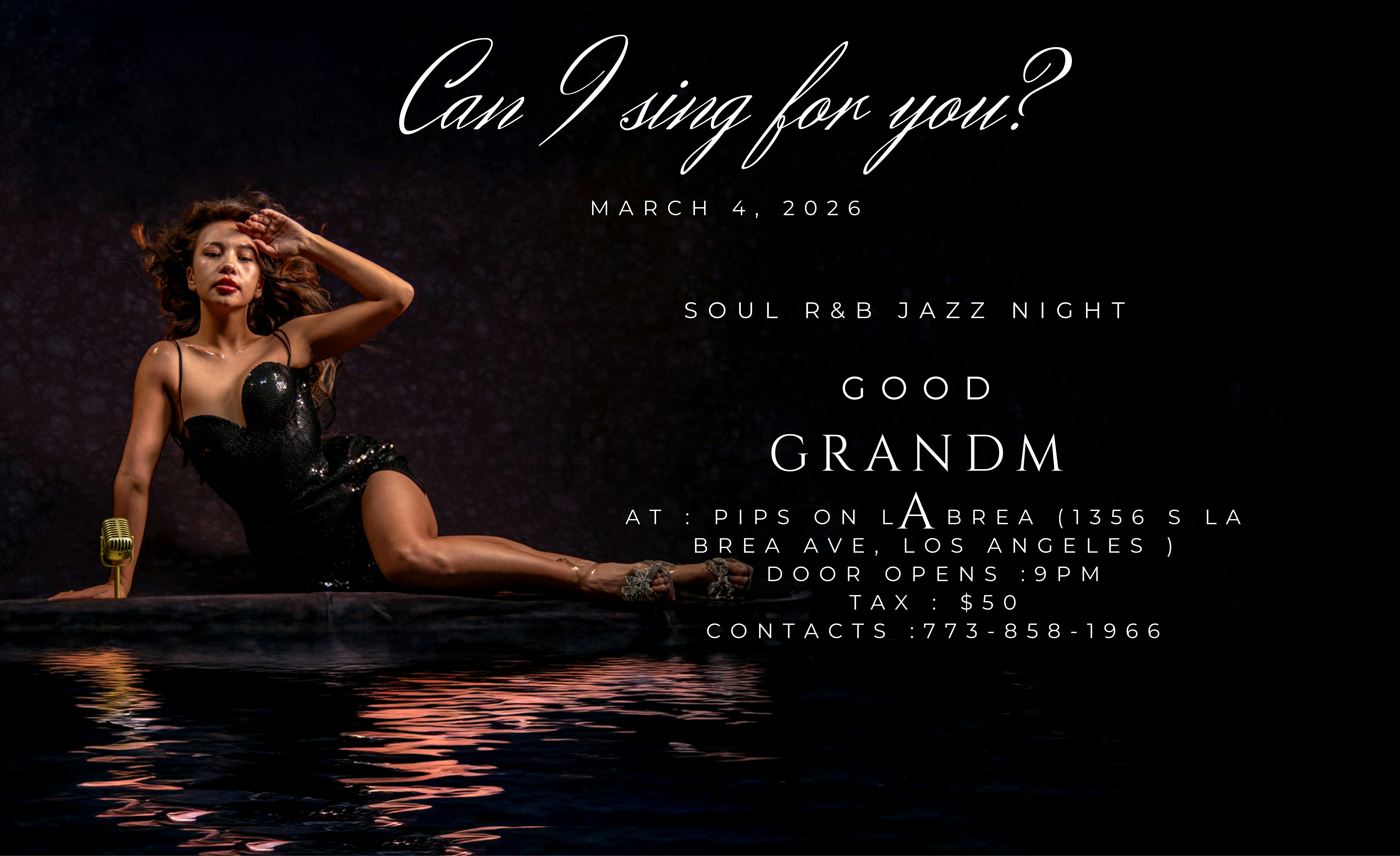 by admin13Feb Can I Sing for You? at Pips On Labrea – Los Angeles, CA Can I Sing for You? at Pips On Labrea – Los Angeles, CA 2 2 people viewed this event. Get ready to showcase your vocal skills and feel the music vibes at Pips On Labrea – it’s your time to shine! Tickets-RSVP Link Date And Time Thursday, March 5th, 2026 05:00 AM (PST) Venue Pips On Labrea Location 1356 South La Brea Avenue, Los Angeles, CA 90019 Event Types Concert or PerformanceMusic Event Category CaliforniaLos Angeles Share With Friends Facebook Twitter Linkedin Xing Pinterest Share This Post: