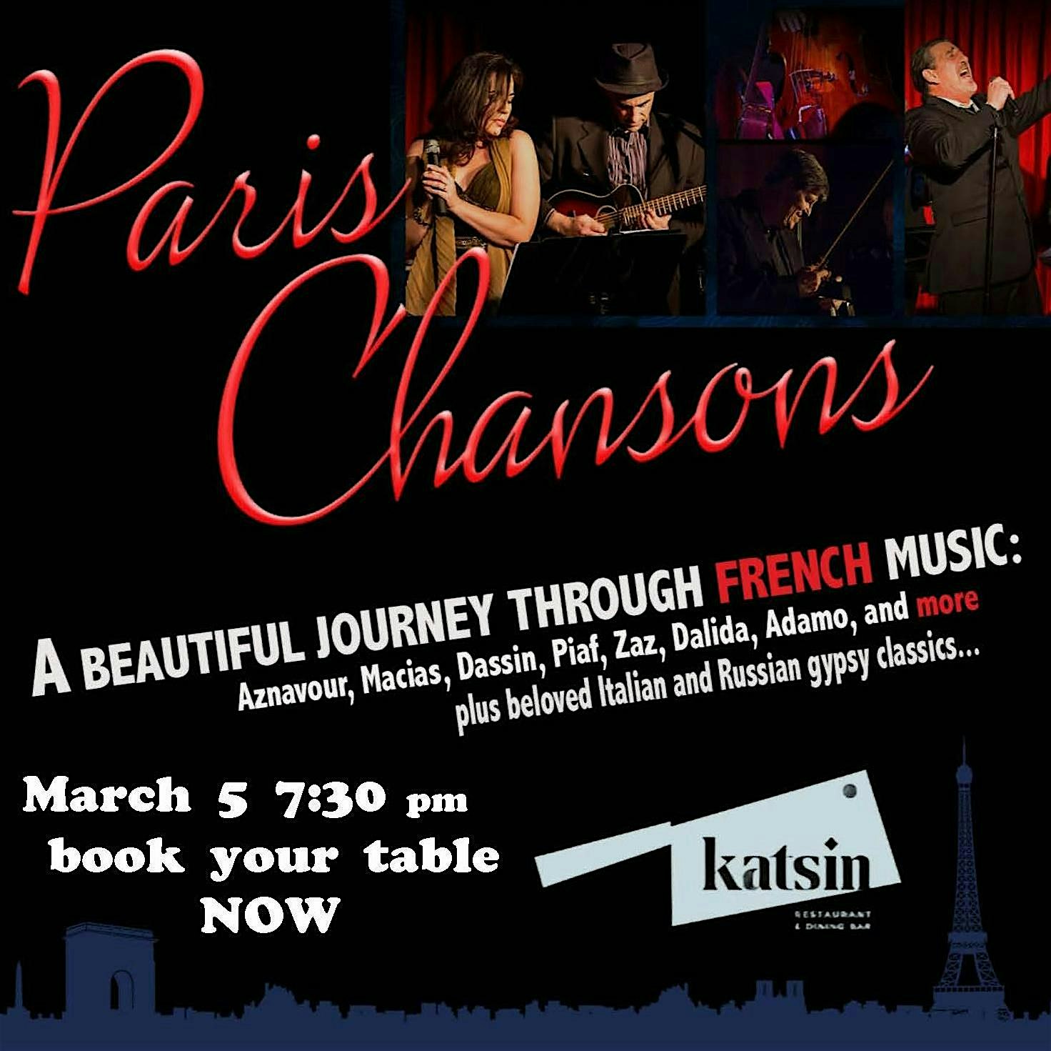 by admin27Feb Chanson French at Katsin Restaurant and Dining Bar – Glendale, CA Chanson French at Katsin Restaurant and Dining Bar – Glendale, CA 2 2 people viewed this event. A beautiful journey through French Music, plus beloved Italian and Russian and Gypsy classics Tickets-RSVP Link Date And Time Thursday, March 5th, 2026 08:00 PM (PST) Venue Katsin Restaurant and Dining Bar Location 515 West Broadway, Glendale, CA 91204 Event Types Concert or PerformanceMusic Event Category California Share With Friends Facebook Twitter Linkedin Xing Pinterest Share This Post: