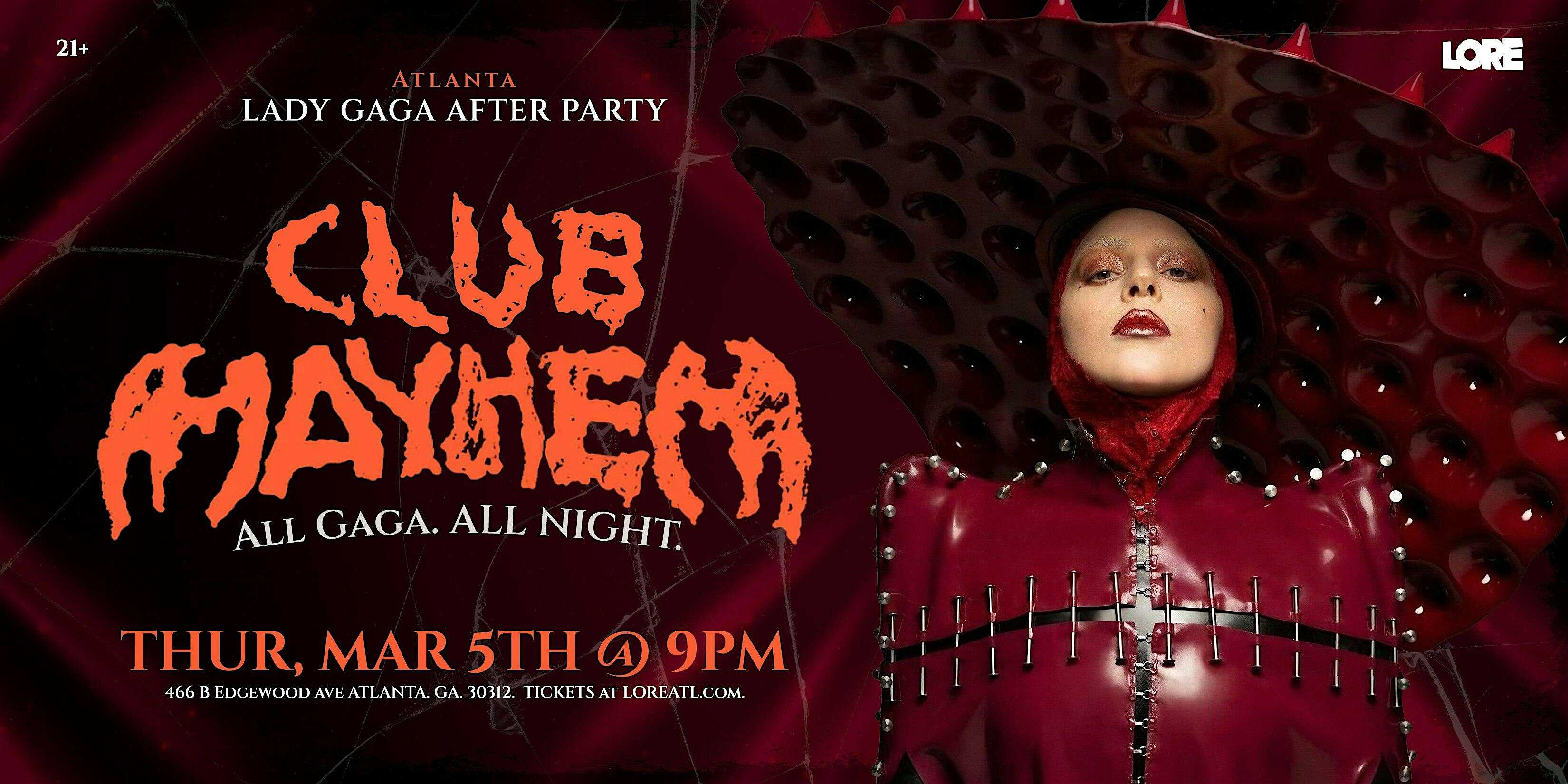 by admin23Feb Club MAYHEM: Lady Gaga Concert After Party at Lore – Atlanta, GA Club MAYHEM: Lady Gaga Concert After Party at Lore – Atlanta, GA 2 2 people viewed this event. All Gaga. All Night. Tickets-RSVP Link Date And Time Thursday, March 5th, 2026 @ 09:00 PM Location 466 Edgewood Avenue Southeast, Atlanta, GA 30312 Event Types MusicParty or Social Gathering Event Category AtlantaGeorgia Share With Friends Facebook Twitter Linkedin Xing Pinterest Share This Post: