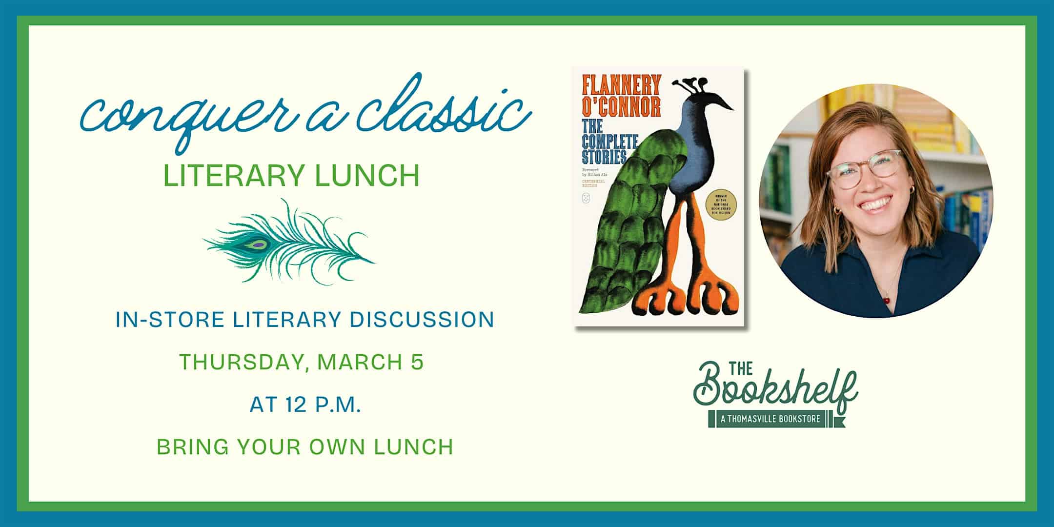 by admin23Feb Conquer A Classic Literary Lunch at The Bookshelf – Thomasville, GA Conquer A Classic Literary Lunch at The Bookshelf – Thomasville, GA 3 3 people viewed this event. Don’t miss joining Annie B. Jones as she chats about the Spring Conquer A Classic featuring the works of Flannery O’Conner. Tickets-RSVP Link Date And Time Thursday, March 5th, 2026 12:00 PM (PST) Venue The Bookshelf Location 126 South Broad Street, Thomasville, GA 31792 Event Types Food & Drink Event Category Georgia Share With Friends Facebook Twitter Linkedin Xing Pinterest Share This Post: