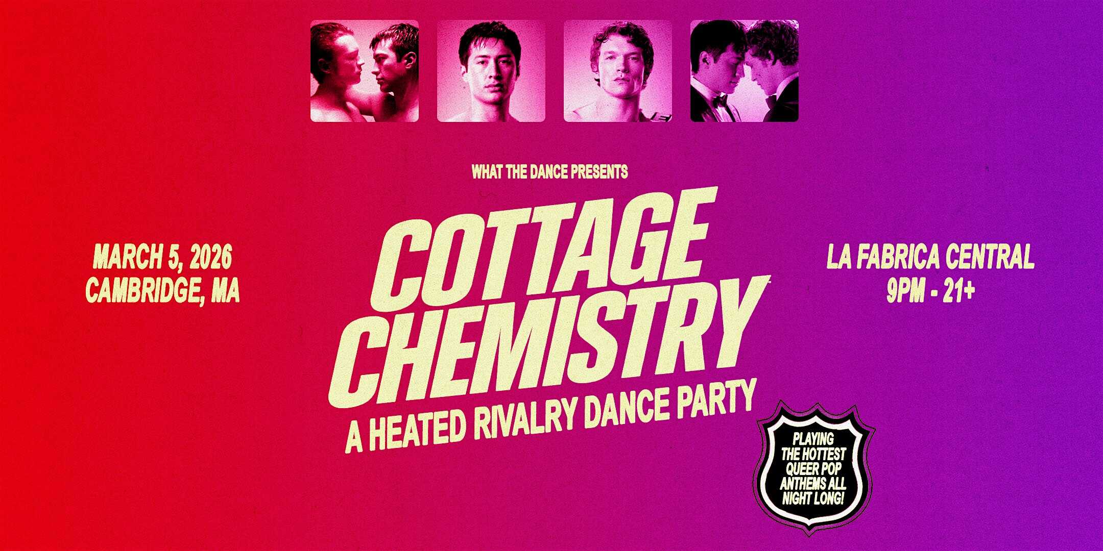 by admin23Feb COTTAGE CHEMISTRY: A HEATED RIVALRY DANCE PARTY – CAMBRIDGE (21+) at La Fabrica Central – Cambridge, MA COTTAGE CHEMISTRY: A HEATED RIVALRY DANCE PARTY – CAMBRIDGE (21+) at La Fabrica Central – Cambridge, MA 2 2 people viewed this event. CAMBRIDGE! Come dance to the Heated Rivalry soundtrack, the hottest queer pop anthems, and nostalgic alt hits all night long! Tickets-RSVP Link Date And Time Thursday, March 5th, 2026 @ 09:00 PM Location 450 Massachusetts Avenue, Cambridge, MA 2139 Event Types MusicParty or Social Gathering Event Category Massachusetts Share With Friends Facebook Twitter Linkedin Xing Pinterest Share This Post: