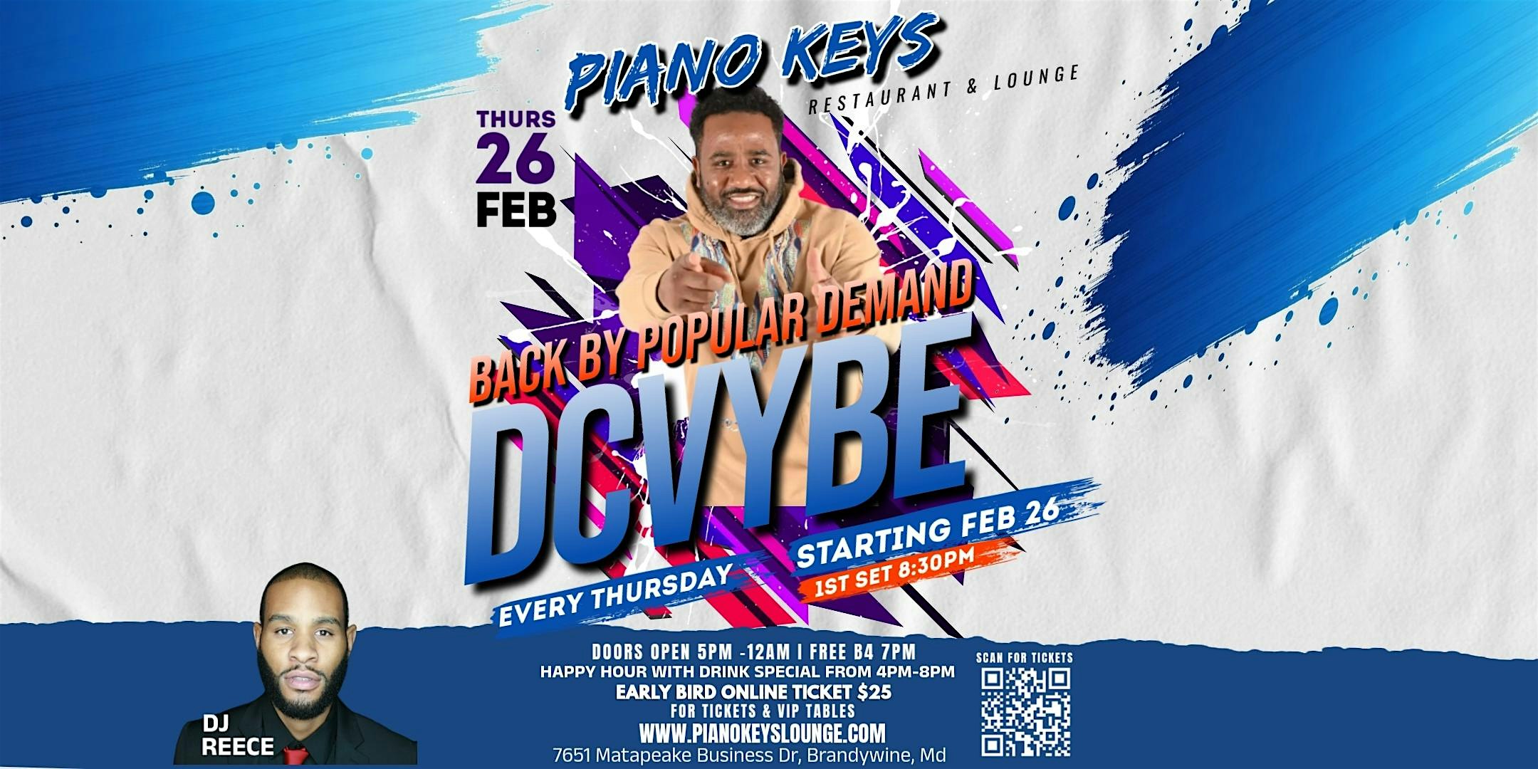 by admin27Feb DCVYBE Live @ Piano Keys Lounge. Every Thursday at Piano Keys Restaurant and Lounge – Brandywine, MD DCVYBE Live @ Piano Keys Lounge. Every Thursday at Piano Keys Restaurant and Lounge – Brandywine, MD 10 10 people viewed this event. DCVYBE Live @ Piano Keys Restaurant & Lounge – Hosted Dickson Tickets-RSVP Link Date And Time Thursday, March 5th, 2026 @ 07:00 PM Location 7651 Matapeake Business Drive, Brandywine, MD 20613 Event Types Concert or PerformanceFood & Drink Event Category MarylandNational Harbor Share With Friends Facebook Twitter Linkedin Xing Pinterest Share This Post: