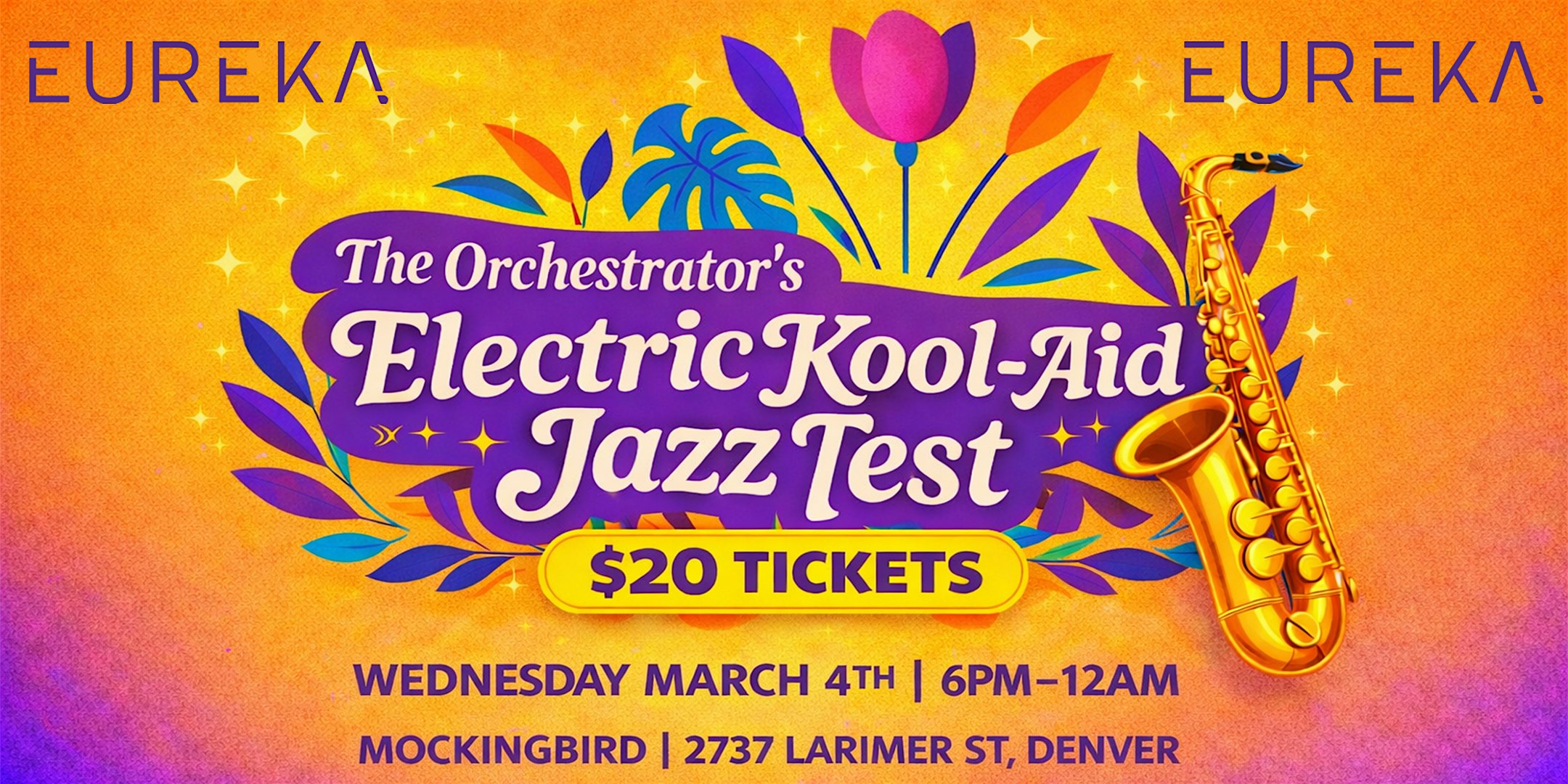 by admin13Feb Eureka Presents The Orchestrator’s Electric Kool-Aid Jazz Test at Mockingbird – Denver, CO Eureka Presents The Orchestrator’s Electric Kool-Aid Jazz Test at Mockingbird – Denver, CO 1 1 people viewed this event. Get ready to vibe live with mind-bending jazz and electric grooves at Eureka’s epic Orchestrator’s test! Tickets-RSVP Link Date And Time Thursday, March 5th, 2026 01:00 AM (PST) Venue Mockingbird Location 2737 Larimer Street, Denver, CO 80205 Event Types Concert or PerformanceMusic Event Category ColoradoDenver Share With Friends Facebook Twitter Linkedin Xing Pinterest Share This Post: