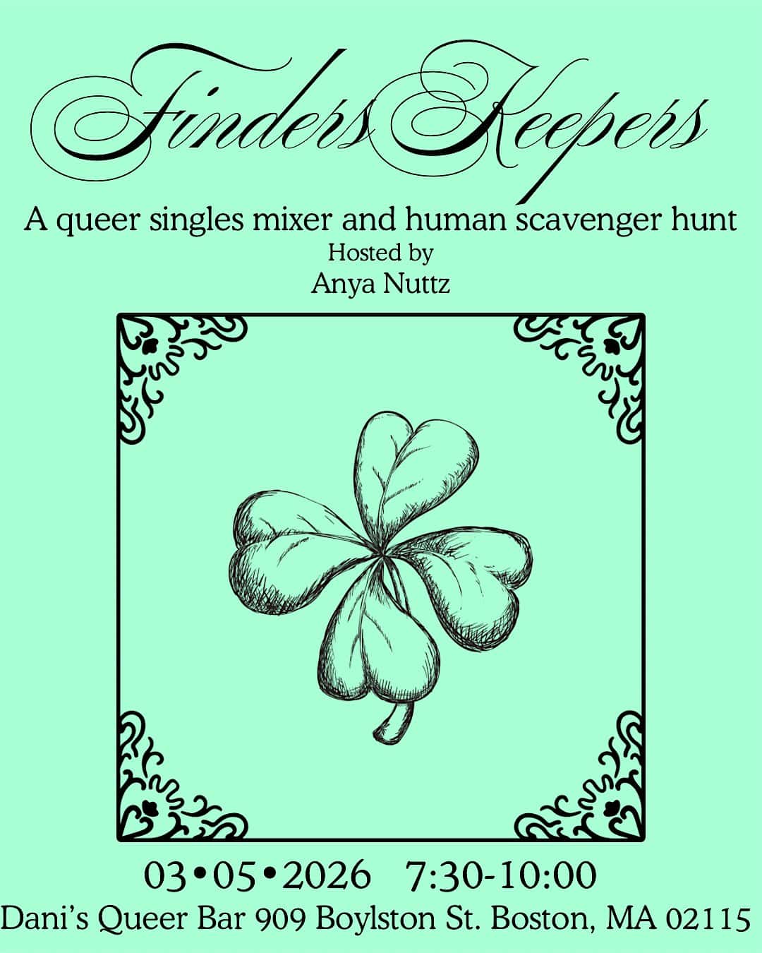 by admin23Feb Finders Keepers Lucky In Love Emerald City Extravaganza at Dani’s Queer Bar – Boston, MA Finders Keepers Lucky In Love Emerald City Extravaganza at Dani’s Queer Bar – Boston, MA 2 2 people viewed this event. A queer singles mixer and human scavenger hunt this month with a very green twist (the green twist is you wearing green) Tickets-RSVP Link Date And Time Thursday, March 5th, 2026 @ 07:00 PM Location 909 Boylston Street, Boston, MA 2115 Event Types Community & CultureParty or Social Gathering Event Category BostonMassachusetts Share With Friends Facebook Twitter Linkedin Xing Pinterest Share This Post: